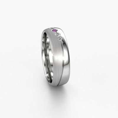 Was für eine perfekte Kombination zwei verschiedener Edelmetalle. Sie scheinen sich im Luxus Design dieses Rings zu verstärken! Unser Goldschiede würde sich freuen, einen einzigartigen Ring für Sie zu kreieren, ganz nach Ihren Wünschen. Jeder Ring, den wir anbieten, wird kunstvoll von Hand in unserem eigenen Atelier angefertigt. Das macht es möglich, dass wir Ihre Luxus in die Realität umsetzen und Ihnen dabei helfen, Ihren eigenen, persönlichen Ring zu kreieren, der an Ihren Stil angepasst ist. Dieser Luxus Weißgold WH0925L36APM Damen Ehering ist mit rund Amethyst besetzt, ±6 mm breit und hat ein mattiert-glänzende Finish. Sie können in unserem Online-Tool eine Kombination aus Edelmetallen wählen. Alles ist möglich! Es ist gut, sich die Eigenschaften der verschiedenen Edelmetalle anzusehen. Gold und Silber sind zum Beispiel weichere Metalle. Die Karat werden durch die Menge der hinzugefügten zusätzlichen Metalle bestimmt. Wenn der Goldschmied nicht viel hinzufügt, sind die Karat höher und der Ehering wird weicher. Wenn er mehr Metalle hinzufügt, hat das Schmuckstück einen geringeren Wert in Karat. Ein weicheres Edelmetall kann trotzdem für Ihre Luxus Ehering verwendet werden! Wenn Sie ein Edelmetall bevorzugen, das ein Leben lang halten wird, empfehlen wir Platin. Es ist das robusteste und langlebigste Metall, dass unser Goldschmied verwendet.Dieser Ehering kann auch als Inspirationsquelle dienen. Möchtest du den Ring matt oder glänzend (ohne Aufpreis) haben, oder lieber breiter oder schmaler? Alles ist möglich. Da es unzählige Variationen gibt, können wir nicht alles auf unserer Website zeigen. Hast du eine Idee für schöne Eheringe oder irgendwo anders ein schönes Set Trauringe gesehen? Kontaktiere uns gerne, unsere Designer stehen bereit, um dir zu helfen.Da wir unsere eigenen Ringe entwerfen und liefern, können wir Ihre Eheringe zu einem Preis anbieten, den Sie nirgendwo anders finden. Ein Ring wird auf Bestellung angefertigt, wodurch kein überschüssiges Material anfällt. So können wir Ihnen ein gutes Angebot zum besten Preis machen.Um es einfacher zu machen, bieten wir eine kostenlose 30-tägige Rücksendung.