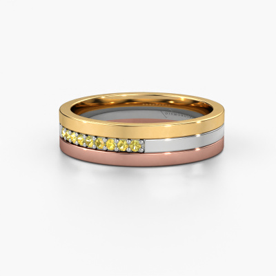 Ein außergewöhnlicher Memoire Weißgold Damen Ehering! Die Kombination der drei verschiedenen Edelmetalle repräsentiert Ihre einzigartige Liebe. Ist das nicht wunderbar? Unser Goldschiede fertigt Ihren Ring in unserem eigenen Atelier. Mit einer einzigartigen Kombination aus purer Goldschmiedekunst und modernsten Techniken können wir Ihren moderne tricolor Ehering perfektionieren. Dieser moderne tricolor WH0413L15AP Ehering ist mit rund Gelb Saphir besetzt, er ist ±5 mm breit und hat ein blinkendes Finish. Passen Sie einfach Ihre Edelsteine und Farben mit unserem Online-Tool an. Unsere Schmuckdesigner erstellen eine 3D-Zeichnung Ihres Designs, damit Sie das Endergebnis sehen können. Unsere Goldschmiede werden anschließend Ihre Ehering nach alter Handwerkskunst von Hand anfertigen. Unser Ziel ist es, den Ehering Ihre Träume anzufertigen. Ein einzigartiger Ehering, der perfekt zu Ihrem Stil passt!Haben Sie noch weitere Wünschen für Ihre Ehering? Zum Beispiel ein schmälerer oder breitere Ring? Oder gerade glänzend oder mattiert? Es gibt noch unendliche andere Variationen. Sie können diese immer mit unseren Schmuckdesigners besprechen. Auch wenn Sie selbst ein Design im Kopf haben, helfen unsere Designers Ihnen gern weiter um Ihre Eheringe weiter zu zeichnen bis dieser komplett nach Ihrem Geschmack ist. Sie können uns gern kontaktieren!Mit unserer modernen Technik, kombiniert mit Handwerk, können wir Schmuckstücke von höchster Qualität mit größter Sorgfalt für Sie entwerfen und anpassen. Unsere Eheringe sind immer um 30 Prozent günstiger als bei anderen Juwelieren. Wir fertigen Eheringe auf Bestellung, also müssen wir keine großen Lager unterhalten.Um es einfacher zu machen, bieten wir eine kostenlose 30-tägige Rücksendung.