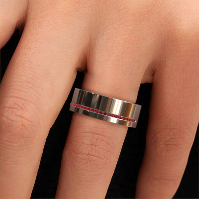 Ein wirklich stylischer, 14 Karat Weißgold moderne Ehering! Dieser exquisite Damen Ehering, wie oben gezeigt, ist mit rund Rubin besetzt. Unsere Goldschmiede stellen jeden Weißgold Ehering in unserem eigenen Atelier her und aus diesem Grund werden die Rubin mit höchster Präzision gesetzt. Dadurch wird das Licht aus jedem Winkel gleichmäßig vom Rubin reflektiert. Die Breite dieses moderne WH0143L17BP Ehering beträgt ±7 mm und er hat ein blinkendes Finish. Der Schmuckdesigner, Mitglied eines spezialisierten Teams, erstellt ein grafisches 3D-Design Ihres Ehering. Wenn es Ihnen gefällt, können Sie auch einen Dummy Ring bestellen, so dass Sie ihn anprobieren und Ihre Ehering vor der Anfertigung sehen können. Anschließend wird unser Goldschmied in unserem eigenen Studio mit großer Sorgfalt Ihren einzigartigen Ring kreieren. Eine sorgfältige Arbeit, denn sowohl das Anfertigen, als auch das Finish Ihre Ehering erfordern ein scharfes Auge. Und genau das macht unser Handwerk so besonders. Ihr einzigartiger Ehering ist das Ergebnis echter leidenschaftlicher Handwerkskunst!Sie können sich gern inspirieren lassen von unseren Modellen. Sie können diesen Ehering auch gern weiter anpassen: breiter oder schmaler? Glänzend oder mattiert? Kein Problem! Auch wenn Sie selbst Ideen haben für einmaligen Eheringe, helfen unsere Schmuckdesigner Ihnen gern weiter, um Ihren Traumring zu fertigen. Sie können uns gern kontaktieren!Nach Erhalt Ihrer Bestellung beginnen unsere Goldschmiede mit Leidenschaft den kreativen Prozess und fertigen Ihre Eheringe in unserem eigenen Studio. Da wir keine großen Lager haben, werden diese Kosten nicht an Sie weitergegeben. Unsere Preisgestaltung ist der Beweis dafür! Wir bieten Schmuck zum niedrigsten Preis, garantiert.Um es einfacher zu machen, bieten wir eine kostenlose 30-tägige Rücksendung.