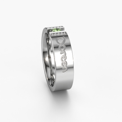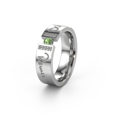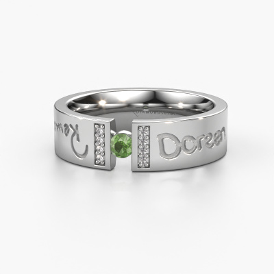 Ein einzigartiger Weißgold Trauring mit Turmalin grün! Was diesen WH2094L16C Damen Trauring so besonders macht ist, dass er mit einem speziellen Text graviert werden kann, der für Sie von Bedeutung ist. Ein Wort, ein kurzer Satz, oder der Teil eines Liedtextes. Welcher Text auch immer für Sie am wichtigsten ist. Erinnern Sie sich daran mit einer exquisiten Gravur in diesem moderne Trauring. Dieser eigenem Text Damen Trauring hat eine Breite von ±6 mm. Sie können in unserem Online-Tool eine Kombination aus Edelmetallen wählen. Alles ist möglich! Es ist gut, sich die Eigenschaften der verschiedenen Edelmetalle anzusehen. Gold und Silber sind zum Beispiel weichere Metalle. Die Karat werden durch die Menge der hinzugefügten zusätzlichen Metalle bestimmt. Wenn der Goldschmied nicht viel hinzufügt, sind die Karat höher und der Trauring wird weicher. Wenn er mehr Metalle hinzufügt, hat das Schmuckstück einen geringeren Wert in Karat. Ein weicheres Edelmetall kann trotzdem für Ihre moderne Trauring verwendet werden! Wenn Sie ein Edelmetall bevorzugen, das ein Leben lang halten wird, empfehlen wir Platin. Es ist das robusteste und langlebigste Metall, dass unser Goldschmied verwendet.Dieser Trauring kann auch als Inspirationsquelle dienen. Möchtest du den Ring matt oder glänzend (ohne Aufpreis) haben, oder lieber breiter oder schmaler? Alles ist möglich. Da es unzählige Variationen gibt, können wir nicht alles auf unserer Website zeigen. Hast du eine Idee für schöne Trauringe oder irgendwo anders ein schönes Set Trauringe gesehen? Kontaktiere uns gerne, unsere Designer stehen bereit, um dir zu helfen.Mit unserer modernen Technik, kombiniert mit Handwerk, können wir Schmuckstücke von höchster Qualität mit größter Sorgfalt für Sie entwerfen und anpassen. Unsere Trauringe sind immer um 30 Prozent günstiger als bei anderen Juwelieren. Wir fertigen Trauringe auf Bestellung, also müssen wir keine großen Lager unterhalten.Um es einfacher zu machen, bieten wir eine kostenlose 30-tägige Rücksendung.