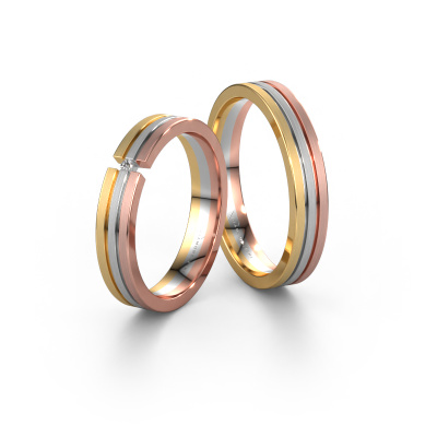 Ein schönes Set von Tricolor Eheringe, in denen drei Farben zu einem Design zu verschmelzen scheinen. Und dieser Ring kann nach Ihren Wünschen angepasst werden! Die Kombination dieser drei Farben symbolisiert die einzigartige Liebe, die Sie teilen. Wirklich wunderbar! Dieses mattes WH0402LM14AM Eheringe Set hat die Kombination 14 Karat Weißgold mit Gold und ist nach Ihrem eigenen Design. Unser erfahrenen Goldschmiede fertigt sie in unserem eigenen Atelier. Die Ehering für Männer haben eine Breite von ±4 mm, die Damen Ehering haben eine Breite von ±4 mm und dieser spezielle Ring, wie er hier gezeigt wird, ist mit Diamanten 0.012 crt besetzt. Weil Ihr Hochzeitstag mit nichts als dem schönsten Diamant gefeiert werden darf. Sehen Sie das auch so?