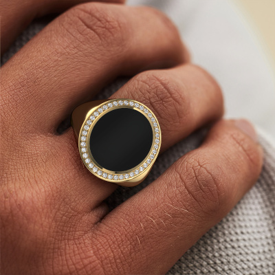 Der ovale Adam 5 Siegelring mit 15x13 mm oval form Onyx Oberfläche, wie oben gezeigt, ist voll von Tradition. Üblicherweise wurde der Siegelring vom Vater an den Sohn weitergegeben. Beginnen Sie Ihre eigene Tradition mit diesem ovale, Gold Siegelring. Wir würden uns auch sehr freuen, Ihren Ring mit einem Monogramm oder einem Familienwappen gravieren zu dürfen. Bitte sehen Sie sich unsere Datenbank für weitere Anfragen und Optionen an. Sie können die Datenbank am unteren Rand dieser Seite finden. Beginnen Sie eine neue Tradition mit dem exklusive Gold Adam 5 Siegelring. Der Diamanten Adam 5 Siegelring, wie hier abgebildet, kann ganz nach Ihren Wünschen gestaltet werden. Unser Online-Tool bietet viele verschiedene Möglichkeiten. Bitte kontaktieren Sie uns, wenn Sie Änderungen an Ihrem Adam 5 Siegelring wünschen, die in unserem Online-Tool nicht verfügbar sind.Unsere talentierten, leidenschaftlichen Designer fügen unserer Online-Kollektion täglich neue Designs hinzu. Zusammen versuchen sie, eine vielfältige Kollektion feinster Schmuckstücke zu erstellen. Wenn Sie es vorziehen, einen Ring nach Ihrem eigenen Entwurf zu machen, können Sie gerne ein Angebot anfordern. Wir machen Ihnen ein großartiges Angebot, basierend auf Qualität und Preis.Nachdem Sie Ihre Bestellung aufgegeben haben, beginnen unsere Goldschmiede mit dem kreativen Prozess der Herstellung Ihres Adam 5 Ring. Wir haben keine Lager. Das ist vorteilhaft, da diese Kosten nicht an Sie weitergegeben werden. Daher sind wir in der Lage, Schmuck zu außergewöhnlich niedrigen Preisen anzubieten.Um es einfacher zu machen, bieten wir eine kostenlose 30-tägige Rücksendung.
