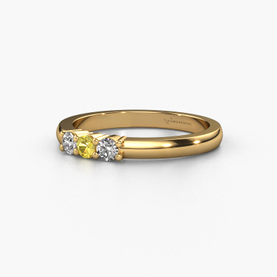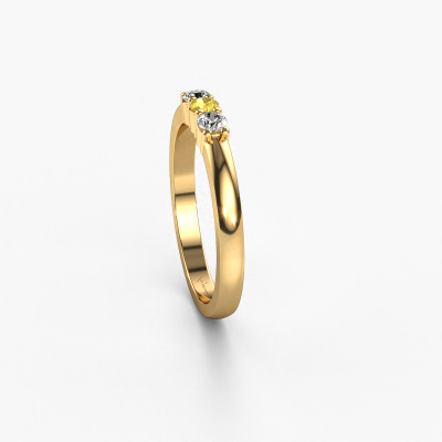 Dieser 3 Stone Ring wird Yasmin 3 genannt. Diese Art von Ring wird als Memoire ring bezeichnet, da seine Edelsteine in einer durchgehenden Linie angeordnet sind. Dadurch kann er einfach mit anderen Ringen kombiniert werden. Das Band dieses 14 Karat Gold Ring ist in einer Kombination aus Gelb Saphir und Lab-grown Diamant besetzt. Sie können ganz einfach online die Kombination auswählen, die Sie bevorzugen. Wie Sie sehen, wird bei diesem Gold Memoire Ring mehre Gelb Saphir gesetzt. Der Memoire ring steht für Zusammenwirken. Und genau das tun diese Edelsteine, zusammenwirken. Zusammen geben sie dem Band eines klassische Ring einen schönen Effekt! So ein bedeutungsvoller Ring, finden Sie nicht auch? Alle von uns ausgesuchten Gelb Saphir werden von unserem erfahrenen Goldschiede in Handarbeit eingefasst. Das ist eine präzise Aufgabe, die nur durch die Kombination von purer Handwerkskunst und dem Einsatz neuester Techniken erfolgreich durchgeführt werden kann, um eine optimale Wirkung zu erzielen. Um eine perfekte Lichtreflexion zu erzeugen, müssen alle Edelsteine auf die gleiche Weise perfekt ausgerichtet sein. Während der Fertigung wird der Goldschmied Meister daher ständig die Lichtreflexion überwachen, um zu gewährleisten, dass die Gelb Saphir perfekt ausgerichtet sind. Das erfordert eine geschickte Hand und viel Geduld, aber dann wird das Endprodukt zu einem echten Kunstwerk. Und genau das ist unsere Mission!Durch die Kombination modernster Technik mit uralter Handwerkskunst können wir alle Ringe in unserem eigenen Studio anfertigen. Jedes Schmuckstück wird auf Anfrage gefertigt. Das ist vorteilhaft, weil wir Ihnen dadurch einen Preis anbieten können, den Sie nirgendwo anders finden.Unsere talentierten, leidenschaftlichen Designer fügen unserer Online-Kollektion täglich neue Designs hinzu. Zusammen versuchen sie, eine vielfältige Kollektion feinster Schmuckstücke zu erstellen. Wenn Sie es vorziehen, einen Ring nach Ihrem eigenen Entwurf zu machen, können Sie gerne ein Angebot anfordern. Wir machen Ihnen ein großartiges Angebot, basierend auf Qualität und Preis.Um es einfacher zu machen, bieten wir eine kostenlose 30-tägige Rücksendung.