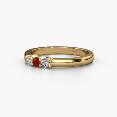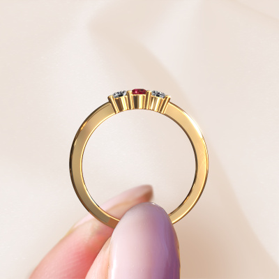 Dieser 3 Stone Ring wird Yasmin 3 genannt. Diese Art von Ring wird als Memoire ring bezeichnet, da seine Edelsteine in einer durchgehenden Linie angeordnet sind. Dadurch kann er einfach mit anderen Ringen kombiniert werden. Das Band dieses 14 Karat Gold Ring ist in einer Kombination aus Rubin und Lab-grown Diamant besetzt. Sie können ganz einfach online die Kombination auswählen, die Sie bevorzugen. Wie Sie sehen, wird bei diesem Gold Memoire Ring mehre Rubin gesetzt. Der Memoire ring steht für Zusammenwirken. Und genau das tun diese Edelsteine, zusammenwirken. Zusammen geben sie dem Band eines klassische Ring einen schönen Effekt! So ein bedeutungsvoller Ring, finden Sie nicht auch? Alle von uns ausgesuchten Rubin werden von unserem erfahrenen Goldschiede in Handarbeit eingefasst. Das ist eine präzise Aufgabe, die nur durch die Kombination von purer Handwerkskunst und dem Einsatz neuester Techniken erfolgreich durchgeführt werden kann, um eine optimale Wirkung zu erzielen. Um eine perfekte Lichtreflexion zu erzeugen, müssen alle Edelsteine auf die gleiche Weise perfekt ausgerichtet sein. Während der Fertigung wird der Goldschmied Meister daher ständig die Lichtreflexion überwachen, um zu gewährleisten, dass die Rubin perfekt ausgerichtet sind. Das erfordert eine geschickte Hand und viel Geduld, aber dann wird das Endprodukt zu einem echten Kunstwerk. Und genau das ist unsere Mission!Durch die Kombination modernster Technik mit uralter Handwerkskunst können wir alle Ringe in unserem eigenen Studio anfertigen. Jedes Schmuckstück wird auf Anfrage gefertigt. Das ist vorteilhaft, weil wir Ihnen dadurch einen Preis anbieten können, den Sie nirgendwo anders finden.Unsere talentierten, leidenschaftlichen Designer fügen unserer Online-Kollektion täglich neue Designs hinzu. Zusammen versuchen sie, eine vielfältige Kollektion feinster Schmuckstücke zu erstellen. Wenn Sie es vorziehen, einen Ring nach Ihrem eigenen Entwurf zu machen, können Sie gerne ein Angebot anfordern. Wir machen Ihnen ein großartiges Angebot, basierend auf Qualität und Preis.Um es einfacher zu machen, bieten wir eine kostenlose 30-tägige Rücksendung.