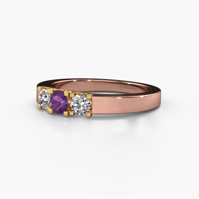 Dieser 3 Stone Ring wird Selina 1 genannt. Diese Art von Ring wird als Memoire ring bezeichnet, da seine Edelsteine in einer durchgehenden Linie angeordnet sind. Dadurch kann er einfach mit anderen Ringen kombiniert werden. Das Band dieses 14 Karat Roségold Ring ist in einer Kombination aus Amethyst und Diamant besetzt. Sie können ganz einfach online die Kombination auswählen, die Sie bevorzugen. Wie Sie sehen, wird bei diesem Roségold Memoire Ring mehre Amethysten gesetzt. Der Memoire ring steht für Zusammenwirken. Und genau das tun diese Edelsteine, zusammenwirken. Zusammen geben sie dem Band eines moderne Ring einen schönen Effekt! So ein bedeutungsvoller Ring, finden Sie nicht auch? Alle von uns ausgesuchten Amethysten werden von unserem erfahrenen Goldschiede in Handarbeit eingefasst. Das ist eine präzise Aufgabe, die nur durch die Kombination von purer Handwerkskunst und dem Einsatz neuester Techniken erfolgreich durchgeführt werden kann, um eine optimale Wirkung zu erzielen. Um eine perfekte Lichtreflexion zu erzeugen, müssen alle Edelsteine auf die gleiche Weise perfekt ausgerichtet sein. Während der Fertigung wird der Goldschmied Meister daher ständig die Lichtreflexion überwachen, um zu gewährleisten, dass die Amethysten perfekt ausgerichtet sind. Das erfordert eine geschickte Hand und viel Geduld, aber dann wird das Endprodukt zu einem echten Kunstwerk. Und genau das ist unsere Mission!Mit unserer modernen Technik können wir Schmuckstücke von höchster Qualität mit größter Sorgfalt für Sie entwerfen und anpassen. Unsere Ringe sind immer um 30 Prozent günstiger als bei anderen Juwelieren. Wir fertigen Ringe auf Bestellung, also müssen wir keine großen Lager unterhalten. Wenn Sie ein bestimmtes Budget haben, beraten wir Sie gerne entsprechend.Unsere Online-Kollektion wird täglich um neue Schmuckdesigns ergänzt. Unser Team von leidenschaftlichen Designern ist bemüht, außergewöhnliche und vielfältige Designs zu kreieren. Haben Sie einen Ring gesehen, der Ihnen gefällt? Setzen Sie sich mit uns in Verbindung. Basierend auf einem guten Preis/Leistungsverhältnis machen wir Ihnen ein Angebot, das Sie nicht ablehnen können!Um es einfacher zu machen, bieten wir eine kostenlose 30-tägige Rücksendung.