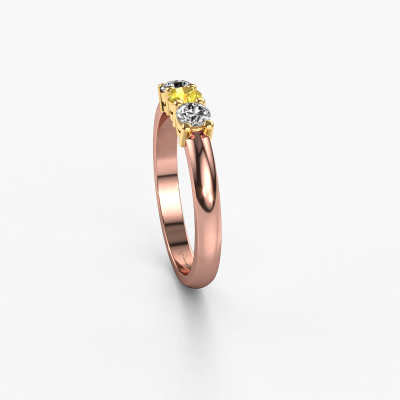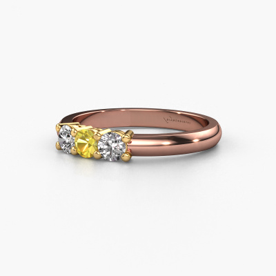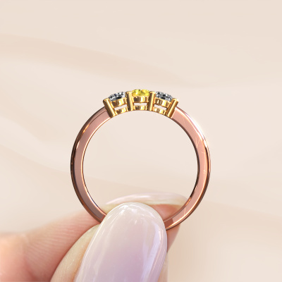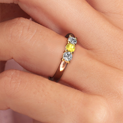 Dieser 3 Stone Ring wird Michelle 3 genannt. Diese Art von Ring wird als Memoire ring bezeichnet, da seine Edelsteine in einer durchgehenden Linie angeordnet sind. Dadurch kann er einfach mit anderen Ringen kombiniert werden. Das Band dieses 14 Karat Roségold Ring ist in einer Kombination aus Gelb Saphir und Lab-grown Diamant besetzt. Sie können ganz einfach online die Kombination auswählen, die Sie bevorzugen. Wie Sie sehen, wird bei diesem Roségold Memoire Ring mehre Gelb Saphir gesetzt. Der Memoire ring steht für Zusammenwirken. Und genau das tun diese Edelsteine, zusammenwirken. Zusammen geben sie dem Band eines klassische Ring einen schönen Effekt! So ein bedeutungsvoller Ring, finden Sie nicht auch? Alle von uns ausgesuchten Gelb Saphir werden von unserem erfahrenen Goldschiede in Handarbeit eingefasst. Das ist eine präzise Aufgabe, die nur durch die Kombination von purer Handwerkskunst und dem Einsatz neuester Techniken erfolgreich durchgeführt werden kann, um eine optimale Wirkung zu erzielen. Um eine perfekte Lichtreflexion zu erzeugen, müssen alle Edelsteine auf die gleiche Weise perfekt ausgerichtet sein. Während der Fertigung wird der Goldschmied Meister daher ständig die Lichtreflexion überwachen, um zu gewährleisten, dass die Gelb Saphir perfekt ausgerichtet sind. Das erfordert eine geschickte Hand und viel Geduld, aber dann wird das Endprodukt zu einem echten Kunstwerk. Und genau das ist unsere Mission!Haben Sie ein bestimmtes Budget? Sie können uns gerne kontaktieren, damit wir Ihre Optionen besprechen können. Wir bieten unsere Ringe zum garantiert besten Preis, denn wir fertigen sie auf Bestellung. Solche Preise finden Sie nirgendwo anders!