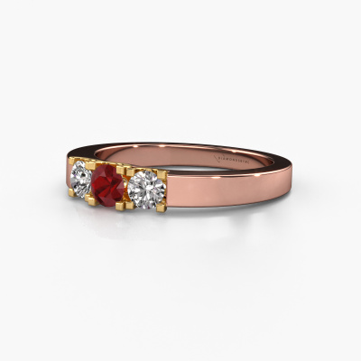 Dieser 3 Stone Ring wird Selina 1 genannt. Diese Art von Ring wird als Memoire ring bezeichnet, da seine Edelsteine in einer durchgehenden Linie angeordnet sind. Dadurch kann er einfach mit anderen Ringen kombiniert werden. Das Band dieses 14 Karat Roségold Ring ist in einer Kombination aus Rubin und Diamant besetzt. Sie können ganz einfach online die Kombination auswählen, die Sie bevorzugen. Wie Sie sehen, wird bei diesem Roségold Memoire Ring mehre Rubin gesetzt. Der Memoire ring steht für Zusammenwirken. Und genau das tun diese Edelsteine, zusammenwirken. Zusammen geben sie dem Band eines moderne Ring einen schönen Effekt! So ein bedeutungsvoller Ring, finden Sie nicht auch? Alle von uns ausgesuchten Rubin werden von unserem erfahrenen Goldschiede in Handarbeit eingefasst. Das ist eine präzise Aufgabe, die nur durch die Kombination von purer Handwerkskunst und dem Einsatz neuester Techniken erfolgreich durchgeführt werden kann, um eine optimale Wirkung zu erzielen. Um eine perfekte Lichtreflexion zu erzeugen, müssen alle Edelsteine auf die gleiche Weise perfekt ausgerichtet sein. Während der Fertigung wird der Goldschmied Meister daher ständig die Lichtreflexion überwachen, um zu gewährleisten, dass die Rubin perfekt ausgerichtet sind. Das erfordert eine geschickte Hand und viel Geduld, aber dann wird das Endprodukt zu einem echten Kunstwerk. Und genau das ist unsere Mission!Mit unserer modernen Technik können wir Schmuckstücke von höchster Qualität mit größter Sorgfalt für Sie entwerfen und anpassen. Unsere Ringe sind immer um 30 Prozent günstiger als bei anderen Juwelieren. Wir fertigen Ringe auf Bestellung, also müssen wir keine großen Lager unterhalten. Wenn Sie ein bestimmtes Budget haben, beraten wir Sie gerne entsprechend.Unsere Online-Kollektion wird täglich um neue Schmuckdesigns ergänzt. Unser Team von leidenschaftlichen Designern ist bemüht, außergewöhnliche und vielfältige Designs zu kreieren. Haben Sie einen Ring gesehen, der Ihnen gefällt? Setzen Sie sich mit uns in Verbindung. Basierend auf einem guten Preis/Leistungsverhältnis machen wir Ihnen ein Angebot, das Sie nicht ablehnen können!Um es einfacher zu machen, bieten wir eine kostenlose 30-tägige Rücksendung.