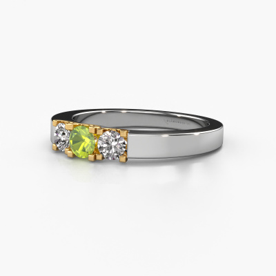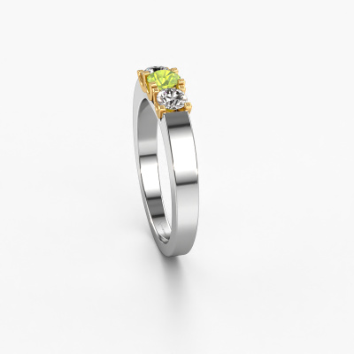 Dieser 3 Stone Ring wird Selina 1 genannt. Diese Art von Ring wird als Memoire ring bezeichnet, da seine Edelsteine in einer durchgehenden Linie angeordnet sind. Dadurch kann er einfach mit anderen Ringen kombiniert werden. Das Band dieses 14 Karat Weißgold Ring ist in einer Kombination aus Peridot und Diamant besetzt. Sie können ganz einfach online die Kombination auswählen, die Sie bevorzugen. Wie Sie sehen, wird bei diesem Weißgold Memoire Ring mehre Peridot gesetzt. Der Memoire ring steht für Zusammenwirken. Und genau das tun diese Edelsteine, zusammenwirken. Zusammen geben sie dem Band eines moderne Ring einen schönen Effekt! So ein bedeutungsvoller Ring, finden Sie nicht auch? Alle von uns ausgesuchten Peridot werden von unserem erfahrenen Goldschiede in Handarbeit eingefasst. Das ist eine präzise Aufgabe, die nur durch die Kombination von purer Handwerkskunst und dem Einsatz neuester Techniken erfolgreich durchgeführt werden kann, um eine optimale Wirkung zu erzielen. Um eine perfekte Lichtreflexion zu erzeugen, müssen alle Edelsteine auf die gleiche Weise perfekt ausgerichtet sein. Während der Fertigung wird der Goldschmied Meister daher ständig die Lichtreflexion überwachen, um zu gewährleisten, dass die Peridot perfekt ausgerichtet sind. Das erfordert eine geschickte Hand und viel Geduld, aber dann wird das Endprodukt zu einem echten Kunstwerk. Und genau das ist unsere Mission!Mit unserer modernen Technik können wir Schmuckstücke von höchster Qualität mit größter Sorgfalt für Sie entwerfen und anpassen. Unsere Ringe sind immer um 30 Prozent günstiger als bei anderen Juwelieren. Wir fertigen Ringe auf Bestellung, also müssen wir keine großen Lager unterhalten. Wenn Sie ein bestimmtes Budget haben, beraten wir Sie gerne entsprechend.Unsere Online-Kollektion wird täglich um neue Schmuckdesigns ergänzt. Unser Team von leidenschaftlichen Designern ist bemüht, außergewöhnliche und vielfältige Designs zu kreieren. Haben Sie einen Ring gesehen, der Ihnen gefällt? Setzen Sie sich mit uns in Verbindung. Basierend auf einem guten Preis/Leistungsverhältnis machen wir Ihnen ein Angebot, das Sie nicht ablehnen können!Um es einfacher zu machen, bieten wir eine kostenlose 30-tägige Rücksendung.