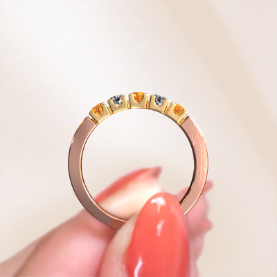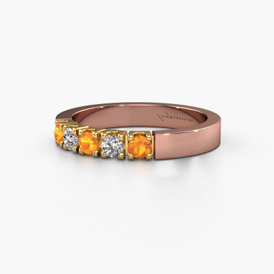 Dieser 5 Stone Ring wird Dana 5 genannt. Diese Art von Ring wird als Memoire ring bezeichnet, da seine Edelsteine in einer durchgehenden Linie angeordnet sind. Dadurch kann er einfach mit anderen Ringen kombiniert werden. Das Band dieses 14 Karat Roségold Ring ist in einer Kombination aus Citrin und Diamant besetzt. Sie können ganz einfach online die Kombination auswählen, die Sie bevorzugen. Wie Sie sehen, wird bei diesem Roségold Memoire Ring mehre Citrin gesetzt. Der Memoire ring steht für Zusammenwirken. Und genau das tun diese Edelsteine, zusammenwirken. Zusammen geben sie dem Band eines moderne Ring einen schönen Effekt! So ein bedeutungsvoller Ring, finden Sie nicht auch? Alle von uns ausgesuchten Citrin werden von unserem erfahrenen Goldschiede in Handarbeit eingefasst. Das ist eine präzise Aufgabe, die nur durch die Kombination von purer Handwerkskunst und dem Einsatz neuester Techniken erfolgreich durchgeführt werden kann, um eine optimale Wirkung zu erzielen. Um eine perfekte Lichtreflexion zu erzeugen, müssen alle Edelsteine auf die gleiche Weise perfekt ausgerichtet sein. Während der Fertigung wird der Goldschmied Meister daher ständig die Lichtreflexion überwachen, um zu gewährleisten, dass die Citrin perfekt ausgerichtet sind. Das erfordert eine geschickte Hand und viel Geduld, aber dann wird das Endprodukt zu einem echten Kunstwerk. Und genau das ist unsere Mission!Da wir unsere eigenen Ringe entwerfen und liefern, können wir Ihnen einen Ring zu einem Preis anbieten, den Sie nirgendwo anders finden. Ein Ring wird auf Bestellung angefertigt, wodurch kein überschüssiges Material anfällt. So können wir Ihnen ein gutes Angebot zum besten Preis machen. Wir verstehen, dass es sich riskant anfühlt, Ihren Ring online zu kaufen. Jedoch helfen wir Ihnen gerne beim Designprozess unter Berücksichtigung Ihres Budgets.Unsere Online-Kollektion wird täglich um neue Schmuckdesigns ergänzt. Unser Team von leidenschaftlichen Designern ist bemüht, außergewöhnliche und vielfältige Designs zu kreieren. Haben Sie einen Ring gesehen, der Ihnen gefällt? Setzen Sie sich mit uns in Verbindung. Basierend auf einem guten Preis/Leistungsverhältnis machen wir Ihnen ein Angebot, das Sie nicht ablehnen können!Um es einfacher zu machen, bieten wir eine kostenlose 30-tägige Rücksendung.