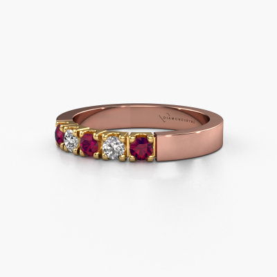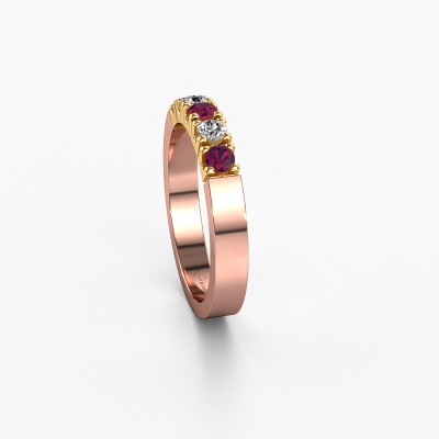 Dieser 5 Stone Ring wird Dana 5 genannt. Diese Art von Ring wird als Memoire ring bezeichnet, da seine Edelsteine in einer durchgehenden Linie angeordnet sind. Dadurch kann er einfach mit anderen Ringen kombiniert werden. Das Band dieses 14 Karat Roségold Ring ist in einer Kombination aus Rhodolit und Diamant besetzt. Sie können ganz einfach online die Kombination auswählen, die Sie bevorzugen. Wie Sie sehen, wird bei diesem Roségold Memoire Ring mehre Rhodolit gesetzt. Der Memoire ring steht für Zusammenwirken. Und genau das tun diese Edelsteine, zusammenwirken. Zusammen geben sie dem Band eines moderne Ring einen schönen Effekt! So ein bedeutungsvoller Ring, finden Sie nicht auch? Alle von uns ausgesuchten Rhodolit werden von unserem erfahrenen Goldschiede in Handarbeit eingefasst. Das ist eine präzise Aufgabe, die nur durch die Kombination von purer Handwerkskunst und dem Einsatz neuester Techniken erfolgreich durchgeführt werden kann, um eine optimale Wirkung zu erzielen. Um eine perfekte Lichtreflexion zu erzeugen, müssen alle Edelsteine auf die gleiche Weise perfekt ausgerichtet sein. Während der Fertigung wird der Goldschmied Meister daher ständig die Lichtreflexion überwachen, um zu gewährleisten, dass die Rhodolit perfekt ausgerichtet sind. Das erfordert eine geschickte Hand und viel Geduld, aber dann wird das Endprodukt zu einem echten Kunstwerk. Und genau das ist unsere Mission!Da wir unsere eigenen Ringe entwerfen und liefern, können wir Ihnen einen Ring zu einem Preis anbieten, den Sie nirgendwo anders finden. Ein Ring wird auf Bestellung angefertigt, wodurch kein überschüssiges Material anfällt. So können wir Ihnen ein gutes Angebot zum besten Preis machen. Wir verstehen, dass es sich riskant anfühlt, Ihren Ring online zu kaufen. Jedoch helfen wir Ihnen gerne beim Designprozess unter Berücksichtigung Ihres Budgets.Unsere Online-Kollektion wird täglich um neue Schmuckdesigns ergänzt. Unser Team von leidenschaftlichen Designern ist bemüht, außergewöhnliche und vielfältige Designs zu kreieren. Haben Sie einen Ring gesehen, der Ihnen gefällt? Setzen Sie sich mit uns in Verbindung. Basierend auf einem guten Preis/Leistungsverhältnis machen wir Ihnen ein Angebot, das Sie nicht ablehnen können!Um es einfacher zu machen, bieten wir eine kostenlose 30-tägige Rücksendung.