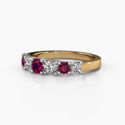 Dieser 7 Stone Ring wird Selina 3 genannt. Diese Art von Ring wird als Memoire ring bezeichnet, da seine Edelsteine in einer durchgehenden Linie angeordnet sind. Dadurch kann er einfach mit anderen Ringen kombiniert werden. Das Band dieses 14 Karat Gold Ring ist in einer Kombination aus Rhodolit und Diamant besetzt. Sie können ganz einfach online die Kombination auswählen, die Sie bevorzugen. Wie Sie sehen, wird bei diesem Gold Memoire Ring mehre Rhodolit gesetzt. Der Memoire ring steht für Zusammenwirken. Und genau das tun diese Edelsteine, zusammenwirken. Zusammen geben sie dem Band eines moderne Ring einen schönen Effekt! So ein bedeutungsvoller Ring, finden Sie nicht auch? Alle von uns ausgesuchten Rhodolit werden von unserem erfahrenen Goldschiede in Handarbeit eingefasst. Das ist eine präzise Aufgabe, die nur durch die Kombination von purer Handwerkskunst und dem Einsatz neuester Techniken erfolgreich durchgeführt werden kann, um eine optimale Wirkung zu erzielen. Um eine perfekte Lichtreflexion zu erzeugen, müssen alle Edelsteine auf die gleiche Weise perfekt ausgerichtet sein. Während der Fertigung wird der Goldschmied Meister daher ständig die Lichtreflexion überwachen, um zu gewährleisten, dass die Rhodolit perfekt ausgerichtet sind. Das erfordert eine geschickte Hand und viel Geduld, aber dann wird das Endprodukt zu einem echten Kunstwerk. Und genau das ist unsere Mission!Da wir unsere eigenen Ringe entwerfen und liefern, können wir Ihnen einen Ring zu einem Preis anbieten, den Sie nirgendwo anders finden. Ein Ring wird auf Bestellung angefertigt, wodurch kein überschüssiges Material anfällt. So können wir Ihnen ein gutes Angebot zum besten Preis machen. Wir verstehen, dass es sich riskant anfühlt, Ihren Ring online zu kaufen. Jedoch helfen wir Ihnen gerne beim Designprozess unter Berücksichtigung Ihres Budgets.Unser Team von talentierten, leidenschaftlichen Designern fügt unserer Online-Kollektion täglich neue Ringe-Designs hinzu. Unser Ziel dabei ist es, Ihnen eine große Vielfalt an Schmuckstücken anbieten zu können. Bitte zögern Sie nicht, ein Angebot anzufordern, wenn Sie spezielle Wünsche für Ihren Ring haben. Wir garantieren Ihnen ein Angebot, das Sie nicht ablehnen können.Um es einfacher zu machen, bieten wir eine kostenlose 30-tägige Rücksendung.