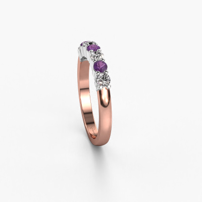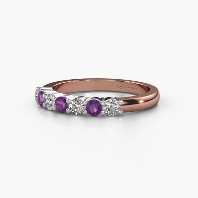 Dieser 7 Stone Ring wird Yasmin 7 genannt. Diese Art von Ring wird als Memoire ring bezeichnet, da seine Edelsteine in einer durchgehenden Linie angeordnet sind. Dadurch kann er einfach mit anderen Ringen kombiniert werden. Das Band dieses 14 Karat Roségold Ring ist in einer Kombination aus Amethyst und Lab-grown Diamant besetzt. Sie können ganz einfach online die Kombination auswählen, die Sie bevorzugen. Wie Sie sehen, wird bei diesem Roségold Memoire Ring mehre Amethysten gesetzt. Der Memoire ring steht für Zusammenwirken. Und genau das tun diese Edelsteine, zusammenwirken. Zusammen geben sie dem Band eines klassische Ring einen schönen Effekt! So ein bedeutungsvoller Ring, finden Sie nicht auch? Alle von uns ausgesuchten Amethysten werden von unserem erfahrenen Goldschiede in Handarbeit eingefasst. Das ist eine präzise Aufgabe, die nur durch die Kombination von purer Handwerkskunst und dem Einsatz neuester Techniken erfolgreich durchgeführt werden kann, um eine optimale Wirkung zu erzielen. Um eine perfekte Lichtreflexion zu erzeugen, müssen alle Edelsteine auf die gleiche Weise perfekt ausgerichtet sein. Während der Fertigung wird der Goldschmied Meister daher ständig die Lichtreflexion überwachen, um zu gewährleisten, dass die Amethysten perfekt ausgerichtet sind. Das erfordert eine geschickte Hand und viel Geduld, aber dann wird das Endprodukt zu einem echten Kunstwerk. Und genau das ist unsere Mission!Nach Erhalt Ihrer Bestellung beginnen unsere Goldschmiede mit Leidenschaft den kreativen Prozess und fertigen Ihren Ring in unserem eigenen Studio. Da wir keine großen Lager haben, werden diese Kosten nicht an Sie weitergegeben. Unsere Preisgestaltung ist der Beweis dafür! Wir bieten Schmuck zum niedrigsten Preis, garantiert.Unser Team von talentierten, leidenschaftlichen Designern fügt unserer Online-Kollektion täglich neue Ringe-Designs hinzu. Unser Ziel dabei ist es, Ihnen eine große Vielfalt an Schmuckstücken anbieten zu können. Bitte zögern Sie nicht, ein Angebot anzufordern, wenn Sie spezielle Wünsche für Ihren Ring haben. Wir garantieren Ihnen ein Angebot, das Sie nicht ablehnen können.Um es einfacher zu machen, bieten wir eine kostenlose 30-tägige Rücksendung.