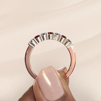 Dieser 7 Stone Ring wird Yasmin 7 genannt. Diese Art von Ring wird als Memoire ring bezeichnet, da seine Edelsteine in einer durchgehenden Linie angeordnet sind. Dadurch kann er einfach mit anderen Ringen kombiniert werden. Das Band dieses 14 Karat Roségold Ring ist in einer Kombination aus Granat und Lab-grown Diamant besetzt. Sie können ganz einfach online die Kombination auswählen, die Sie bevorzugen. Wie Sie sehen, wird bei diesem Roségold Memoire Ring mehre Granat gesetzt. Der Memoire ring steht für Zusammenwirken. Und genau das tun diese Edelsteine, zusammenwirken. Zusammen geben sie dem Band eines klassische Ring einen schönen Effekt! So ein bedeutungsvoller Ring, finden Sie nicht auch? Alle von uns ausgesuchten Granat werden von unserem erfahrenen Goldschiede in Handarbeit eingefasst. Das ist eine präzise Aufgabe, die nur durch die Kombination von purer Handwerkskunst und dem Einsatz neuester Techniken erfolgreich durchgeführt werden kann, um eine optimale Wirkung zu erzielen. Um eine perfekte Lichtreflexion zu erzeugen, müssen alle Edelsteine auf die gleiche Weise perfekt ausgerichtet sein. Während der Fertigung wird der Goldschmied Meister daher ständig die Lichtreflexion überwachen, um zu gewährleisten, dass die Granat perfekt ausgerichtet sind. Das erfordert eine geschickte Hand und viel Geduld, aber dann wird das Endprodukt zu einem echten Kunstwerk. Und genau das ist unsere Mission!Nach Erhalt Ihrer Bestellung beginnen unsere Goldschmiede mit Leidenschaft den kreativen Prozess und fertigen Ihren Ring in unserem eigenen Studio. Da wir keine großen Lager haben, werden diese Kosten nicht an Sie weitergegeben. Unsere Preisgestaltung ist der Beweis dafür! Wir bieten Schmuck zum niedrigsten Preis, garantiert.Unser Team von talentierten, leidenschaftlichen Designern fügt unserer Online-Kollektion täglich neue Ringe-Designs hinzu. Unser Ziel dabei ist es, Ihnen eine große Vielfalt an Schmuckstücken anbieten zu können. Bitte zögern Sie nicht, ein Angebot anzufordern, wenn Sie spezielle Wünsche für Ihren Ring haben. Wir garantieren Ihnen ein Angebot, das Sie nicht ablehnen können.Um es einfacher zu machen, bieten wir eine kostenlose 30-tägige Rücksendung.