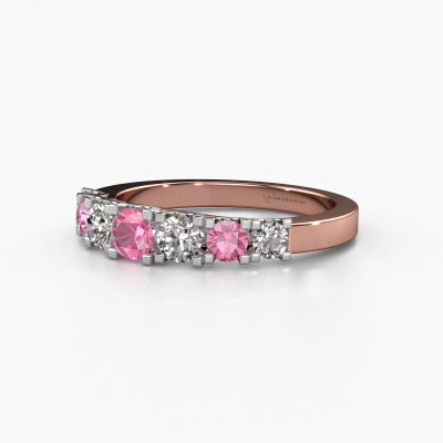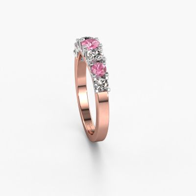 Dieser 7 Stone Ring wird Selina 3 genannt. Diese Art von Ring wird als Memoire ring bezeichnet, da seine Edelsteine in einer durchgehenden Linie angeordnet sind. Dadurch kann er einfach mit anderen Ringen kombiniert werden. Das Band dieses 14 Karat Roségold Ring ist in einer Kombination aus Pink Saphir und Diamant besetzt. Sie können ganz einfach online die Kombination auswählen, die Sie bevorzugen. Wie Sie sehen, wird bei diesem Roségold Memoire Ring mehre Pink Saphir gesetzt. Der Memoire ring steht für Zusammenwirken. Und genau das tun diese Edelsteine, zusammenwirken. Zusammen geben sie dem Band eines moderne Ring einen schönen Effekt! So ein bedeutungsvoller Ring, finden Sie nicht auch? Alle von uns ausgesuchten Pink Saphir werden von unserem erfahrenen Goldschiede in Handarbeit eingefasst. Das ist eine präzise Aufgabe, die nur durch die Kombination von purer Handwerkskunst und dem Einsatz neuester Techniken erfolgreich durchgeführt werden kann, um eine optimale Wirkung zu erzielen. Um eine perfekte Lichtreflexion zu erzeugen, müssen alle Edelsteine auf die gleiche Weise perfekt ausgerichtet sein. Während der Fertigung wird der Goldschmied Meister daher ständig die Lichtreflexion überwachen, um zu gewährleisten, dass die Pink Saphir perfekt ausgerichtet sind. Das erfordert eine geschickte Hand und viel Geduld, aber dann wird das Endprodukt zu einem echten Kunstwerk. Und genau das ist unsere Mission!Da wir unsere eigenen Ringe entwerfen und liefern, können wir Ihnen einen Ring zu einem Preis anbieten, den Sie nirgendwo anders finden. Ein Ring wird auf Bestellung angefertigt, wodurch kein überschüssiges Material anfällt. So können wir Ihnen ein gutes Angebot zum besten Preis machen. Wir verstehen, dass es sich riskant anfühlt, Ihren Ring online zu kaufen. Jedoch helfen wir Ihnen gerne beim Designprozess unter Berücksichtigung Ihres Budgets.Unser Team von talentierten, leidenschaftlichen Designern fügt unserer Online-Kollektion täglich neue Ringe-Designs hinzu. Unser Ziel dabei ist es, Ihnen eine große Vielfalt an Schmuckstücken anbieten zu können. Bitte zögern Sie nicht, ein Angebot anzufordern, wenn Sie spezielle Wünsche für Ihren Ring haben. Wir garantieren Ihnen ein Angebot, das Sie nicht ablehnen können.Um es einfacher zu machen, bieten wir eine kostenlose 30-tägige Rücksendung.