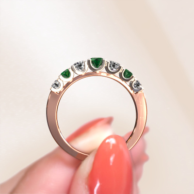 Dieser 7 Stone Ring wird Selina 3 genannt. Diese Art von Ring wird als Memoire ring bezeichnet, da seine Edelsteine in einer durchgehenden Linie angeordnet sind. Dadurch kann er einfach mit anderen Ringen kombiniert werden. Das Band dieses 14 Karat Roségold Ring ist in einer Kombination aus Smaragd und Diamant besetzt. Sie können ganz einfach online die Kombination auswählen, die Sie bevorzugen. Wie Sie sehen, wird bei diesem Roségold Memoire Ring mehre Smaragd gesetzt. Der Memoire ring steht für Zusammenwirken. Und genau das tun diese Edelsteine, zusammenwirken. Zusammen geben sie dem Band eines moderne Ring einen schönen Effekt! So ein bedeutungsvoller Ring, finden Sie nicht auch? Alle von uns ausgesuchten Smaragd werden von unserem erfahrenen Goldschiede in Handarbeit eingefasst. Das ist eine präzise Aufgabe, die nur durch die Kombination von purer Handwerkskunst und dem Einsatz neuester Techniken erfolgreich durchgeführt werden kann, um eine optimale Wirkung zu erzielen. Um eine perfekte Lichtreflexion zu erzeugen, müssen alle Edelsteine auf die gleiche Weise perfekt ausgerichtet sein. Während der Fertigung wird der Goldschmied Meister daher ständig die Lichtreflexion überwachen, um zu gewährleisten, dass die Smaragd perfekt ausgerichtet sind. Das erfordert eine geschickte Hand und viel Geduld, aber dann wird das Endprodukt zu einem echten Kunstwerk. Und genau das ist unsere Mission!Da wir unsere eigenen Ringe entwerfen und liefern, können wir Ihnen einen Ring zu einem Preis anbieten, den Sie nirgendwo anders finden. Ein Ring wird auf Bestellung angefertigt, wodurch kein überschüssiges Material anfällt. So können wir Ihnen ein gutes Angebot zum besten Preis machen. Wir verstehen, dass es sich riskant anfühlt, Ihren Ring online zu kaufen. Jedoch helfen wir Ihnen gerne beim Designprozess unter Berücksichtigung Ihres Budgets.Unser Team von talentierten, leidenschaftlichen Designern fügt unserer Online-Kollektion täglich neue Ringe-Designs hinzu. Unser Ziel dabei ist es, Ihnen eine große Vielfalt an Schmuckstücken anbieten zu können. Bitte zögern Sie nicht, ein Angebot anzufordern, wenn Sie spezielle Wünsche für Ihren Ring haben. Wir garantieren Ihnen ein Angebot, das Sie nicht ablehnen können.Um es einfacher zu machen, bieten wir eine kostenlose 30-tägige Rücksendung.