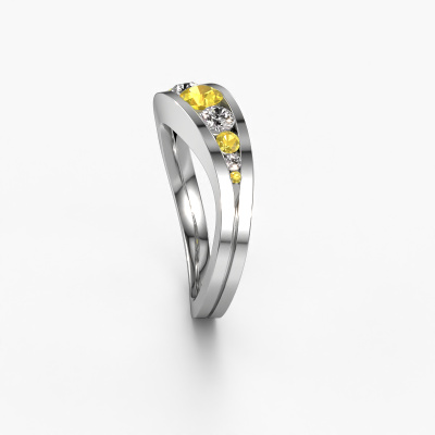 Dieser Ring namens Sigrid 2 besteht aus 14 Karat Weißgold und ist mit Gelb Saphir besetzt. Sind Sie auf der Suche nach einem einzigartigen Weißgold Ring mit moderner Note? Dann könnte dieser Ring zu Ihnen passen. Einfach nach Ihren Wünschen anpassen. Er passt zur zeitgenössischen, modernen Frau. Dieser 9 Stone Ring ist mit wunderschönen Gelb Saphir besetzt. Er wurde sorgfältig ausgewählt. Weil Ihr Ring mit nichts als dem atemberaubendsten Edelstein gekrönt werden soll. Unser erfahrener Goldschiede kreiert Ihren Ring in unserem eigenen Studio, wo der Gelb Saphir mit großer Sorgfalt gesetzt wird. Der Ring wird dann perfekt poliert, um einen atemberaubenden Ring zu erhalten. Durch die Kombination modernster Technik mit uralter Handwerkskunst können wir alle Ringe in unserem eigenen Studio anfertigen. Jedes Schmuckstück wird auf Anfrage gefertigt. Das ist vorteilhaft, weil wir Ihnen dadurch einen Preis anbieten können, den Sie nirgendwo anders finden.Unser Team von talentierten, leidenschaftlichen Designern fügt unserer Online-Kollektion täglich neue Ring-Designs hinzu. Unser Ziel dabei ist es, Ihnen eine große Vielfalt an Schmuckstücken anbieten zu können. Bitte zögern Sie nicht, ein Angebot anzufordern, wenn Sie spezielle Wünsche für Ihren Ring haben. Wir garantieren Ihnen ein Angebot, das Sie nicht ablehnen können.Um es einfacher zu machen, bieten wir eine kostenlose 30-tägige Rücksendung.