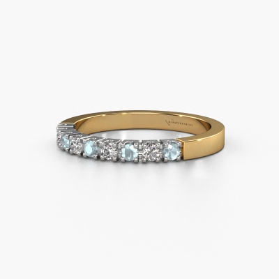 Dieser 9 Stone Ring wird Dana 9 genannt. Diese Art von Ring wird als Memoire ring bezeichnet, da seine Edelsteine in einer durchgehenden Linie angeordnet sind. Dadurch kann er einfach mit anderen Ringen kombiniert werden. Das Band dieses 14 Karat Gold Ring ist in einer Kombination aus Aquamarin und Diamant besetzt. Sie können ganz einfach online die Kombination auswählen, die Sie bevorzugen. Wie Sie sehen, wird bei diesem Gold Memoire Ring mehre Aquamarins gesetzt. Der Memoire ring steht für Zusammenwirken. Und genau das tun diese Edelsteine, zusammenwirken. Zusammen geben sie dem Band eines moderne Ring einen schönen Effekt! So ein bedeutungsvoller Ring, finden Sie nicht auch? Alle von uns ausgesuchten Aquamarins werden von unserem erfahrenen Goldschiede in Handarbeit eingefasst. Das ist eine präzise Aufgabe, die nur durch die Kombination von purer Handwerkskunst und dem Einsatz neuester Techniken erfolgreich durchgeführt werden kann, um eine optimale Wirkung zu erzielen. Um eine perfekte Lichtreflexion zu erzeugen, müssen alle Edelsteine auf die gleiche Weise perfekt ausgerichtet sein. Während der Fertigung wird der Goldschmied Meister daher ständig die Lichtreflexion überwachen, um zu gewährleisten, dass die Aquamarins perfekt ausgerichtet sind. Das erfordert eine geschickte Hand und viel Geduld, aber dann wird das Endprodukt zu einem echten Kunstwerk. Und genau das ist unsere Mission!Nach Erhalt Ihrer Bestellung beginnen unsere Goldschmiede mit Leidenschaft den kreativen Prozess und fertigen Ihren Ring in unserem eigenen Studio. Da wir keine großen Lager haben, werden diese Kosten nicht an Sie weitergegeben. Unsere Preisgestaltung ist der Beweis dafür! Wir bieten Schmuck zum niedrigsten Preis, garantiert.Unsere talentierten, leidenschaftlichen Designer fügen unserer Online-Kollektion täglich neue Designs hinzu. Zusammen versuchen sie, eine vielfältige Kollektion feinster Schmuckstücke zu erstellen. Wenn Sie es vorziehen, einen Ring nach Ihrem eigenen Entwurf zu machen, können Sie gerne ein Angebot anfordern. Wir machen Ihnen ein großartiges Angebot, basierend auf Qualität und Preis.Um es einfacher zu machen, bieten wir eine kostenlose 30-tägige Rücksendung.