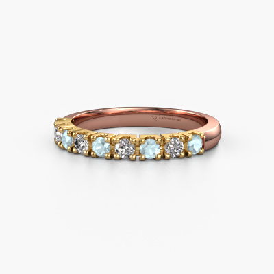 Dieser 9 Stone Ring wird Rianne 9 genannt. Diese Art von Ring wird als Memoire ring bezeichnet, da seine Edelsteine in einer durchgehenden Linie angeordnet sind. Dadurch kann er einfach mit anderen Ringen kombiniert werden. Das Band dieses 14 Karat Roségold Ring ist in einer Kombination aus Aquamarin und Diamant besetzt. Sie können ganz einfach online die Kombination auswählen, die Sie bevorzugen. Wie Sie sehen, wird bei diesem Roségold Memoire Ring mehre Aquamarins gesetzt. Der Memoire ring steht für Zusammenwirken. Und genau das tun diese Edelsteine, zusammenwirken. Zusammen geben sie dem Band eines klassische Ring einen schönen Effekt! So ein bedeutungsvoller Ring, finden Sie nicht auch? Alle von uns ausgesuchten Aquamarins werden von unserem erfahrenen Goldschiede in Handarbeit eingefasst. Das ist eine präzise Aufgabe, die nur durch die Kombination von purer Handwerkskunst und dem Einsatz neuester Techniken erfolgreich durchgeführt werden kann, um eine optimale Wirkung zu erzielen. Um eine perfekte Lichtreflexion zu erzeugen, müssen alle Edelsteine auf die gleiche Weise perfekt ausgerichtet sein. Während der Fertigung wird der Goldschmied Meister daher ständig die Lichtreflexion überwachen, um zu gewährleisten, dass die Aquamarins perfekt ausgerichtet sind. Das erfordert eine geschickte Hand und viel Geduld, aber dann wird das Endprodukt zu einem echten Kunstwerk. Und genau das ist unsere Mission!Haben Sie ein bestimmtes Budget? Sie können uns gerne kontaktieren, damit wir Ihre Optionen besprechen können. Wir bieten unsere Ringe zum garantiert besten Preis, denn wir fertigen sie auf Bestellung. Solche Preise finden Sie nirgendwo anders!
