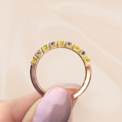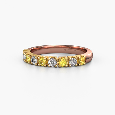 Dieser 9 Stone Ring wird Rianne 9 genannt. Diese Art von Ring wird als Memoire ring bezeichnet, da seine Edelsteine in einer durchgehenden Linie angeordnet sind. Dadurch kann er einfach mit anderen Ringen kombiniert werden. Das Band dieses 14 Karat Roségold Ring ist in einer Kombination aus Gelb Saphir und Diamant besetzt. Sie können ganz einfach online die Kombination auswählen, die Sie bevorzugen. Wie Sie sehen, wird bei diesem Roségold Memoire Ring mehre Gelb Saphir gesetzt. Der Memoire ring steht für Zusammenwirken. Und genau das tun diese Edelsteine, zusammenwirken. Zusammen geben sie dem Band eines klassische Ring einen schönen Effekt! So ein bedeutungsvoller Ring, finden Sie nicht auch? Alle von uns ausgesuchten Gelb Saphir werden von unserem erfahrenen Goldschiede in Handarbeit eingefasst. Das ist eine präzise Aufgabe, die nur durch die Kombination von purer Handwerkskunst und dem Einsatz neuester Techniken erfolgreich durchgeführt werden kann, um eine optimale Wirkung zu erzielen. Um eine perfekte Lichtreflexion zu erzeugen, müssen alle Edelsteine auf die gleiche Weise perfekt ausgerichtet sein. Während der Fertigung wird der Goldschmied Meister daher ständig die Lichtreflexion überwachen, um zu gewährleisten, dass die Gelb Saphir perfekt ausgerichtet sind. Das erfordert eine geschickte Hand und viel Geduld, aber dann wird das Endprodukt zu einem echten Kunstwerk. Und genau das ist unsere Mission!Haben Sie ein bestimmtes Budget? Sie können uns gerne kontaktieren, damit wir Ihre Optionen besprechen können. Wir bieten unsere Ringe zum garantiert besten Preis, denn wir fertigen sie auf Bestellung. Solche Preise finden Sie nirgendwo anders!