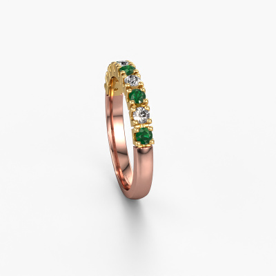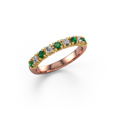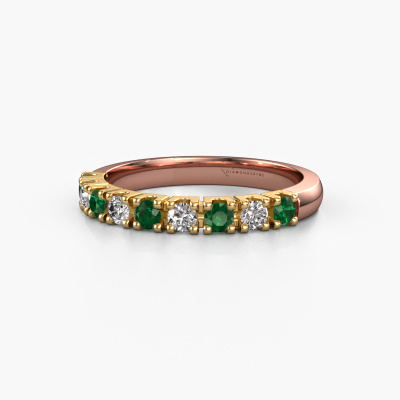 Dieser 9 Stone Ring wird Rianne 9 genannt. Diese Art von Ring wird als Memoire ring bezeichnet, da seine Edelsteine in einer durchgehenden Linie angeordnet sind. Dadurch kann er einfach mit anderen Ringen kombiniert werden. Das Band dieses 14 Karat Roségold Ring ist in einer Kombination aus Smaragd und Diamant besetzt. Sie können ganz einfach online die Kombination auswählen, die Sie bevorzugen. Wie Sie sehen, wird bei diesem Roségold Memoire Ring mehre Smaragd gesetzt. Der Memoire ring steht für Zusammenwirken. Und genau das tun diese Edelsteine, zusammenwirken. Zusammen geben sie dem Band eines klassische Ring einen schönen Effekt! So ein bedeutungsvoller Ring, finden Sie nicht auch? Alle von uns ausgesuchten Smaragd werden von unserem erfahrenen Goldschiede in Handarbeit eingefasst. Das ist eine präzise Aufgabe, die nur durch die Kombination von purer Handwerkskunst und dem Einsatz neuester Techniken erfolgreich durchgeführt werden kann, um eine optimale Wirkung zu erzielen. Um eine perfekte Lichtreflexion zu erzeugen, müssen alle Edelsteine auf die gleiche Weise perfekt ausgerichtet sein. Während der Fertigung wird der Goldschmied Meister daher ständig die Lichtreflexion überwachen, um zu gewährleisten, dass die Smaragd perfekt ausgerichtet sind. Das erfordert eine geschickte Hand und viel Geduld, aber dann wird das Endprodukt zu einem echten Kunstwerk. Und genau das ist unsere Mission!Haben Sie ein bestimmtes Budget? Sie können uns gerne kontaktieren, damit wir Ihre Optionen besprechen können. Wir bieten unsere Ringe zum garantiert besten Preis, denn wir fertigen sie auf Bestellung. Solche Preise finden Sie nirgendwo anders!