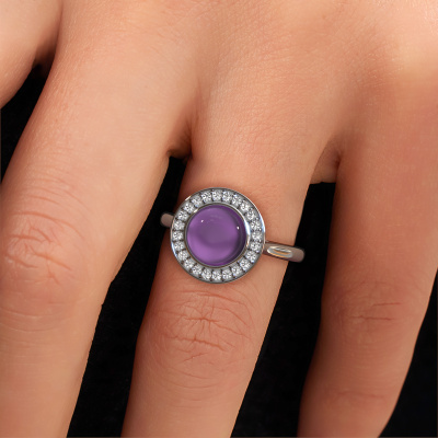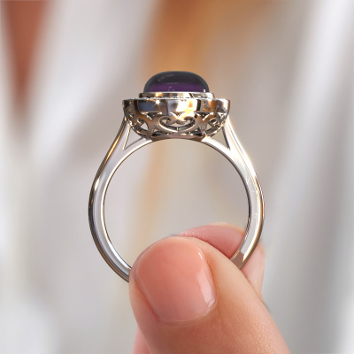 Suchen Sie einen reiche Ring mit einem auffälligen,einzelnen Edelstein? Wie gefällt Ihnen dieser Alisa Ring? Dieser Platin Alisa Ring ist mit einem wunderschönen 8 mm rund cabochon Amethyst besetzt. Der Amethyst wird von unseren Amethysten-Lieferanten sorgfältig ausgewählt. Anschließend werden diese Edelsteine nach alter Tradition von unserem Goldschiede gesetzt. Der Ring wird dann zur Perfektion poliert und zu einem einzigartigen Ring mit einem atemberaubenden Amethyst. Speziell für Sie angefertigt. Ein individueller, Fantasie reiche Ring ist das perfekte Geschenk! Unser Team von leidenschaftlichen Goldschmieden fügt täglich neue exquisite Designs hinzu. Und jedes Design kann angepasst werden. Passen Sie zum Beispiel einfach die Edelmetalle und die Farbe der verwendeten Edelsteine an. Das macht Ihr Design des Fantasie Alisa Ring wirklich einzigartig!Haben Sie ein bestimmtes Budget? Sie können uns gerne kontaktieren, damit wir Ihre Optionen besprechen können. Wir bieten unsere Ringe zum garantiert besten Preis, denn wir fertigen sie auf Bestellung. Solche Preise finden Sie nirgendwo anders!Um es einfacher zu machen, bieten wir eine kostenlose 30-tägige Rücksendung.