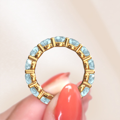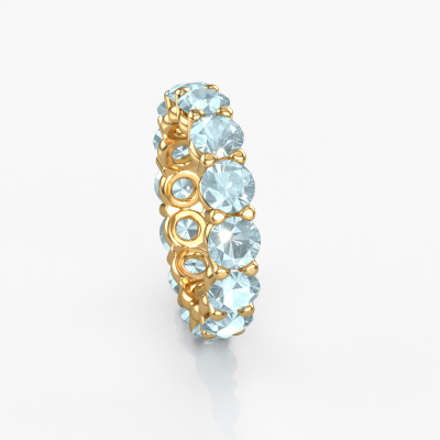 Das ist unser Heddy rnd 4.7-Ring. Dieser spezielle Typ wird als Eternity ring bezeichnet und ist mit einer durchgehenden Linie von identisch geschliffenen Edelsteinen besetzt. Er ist aus 14 Karat Gold und mit kleineren Aquamarin 4.7 mm besetzt. Dieser Gold Eternity Ring ist eine wunderschöne und sinnvolle Möglichkeit, Ihrem Antrag eine besondere Note zu verleihen. Die herrlich gleichmäßig geformten Aquamarins sind rund um den Ring eingefasst. Die identischen Aquamarins werden sorgfältig ausgewählt, um dem Ring eine maximale Wirkung zu verleihen. Denken Sie daran, dass wir natürliche Ressourcen verwenden. Daher sind kleine Unterschiede zwischen den Steinen üblich. Der besondere Effekt wird durch die präzise Positionierung der Aquamarins noch verstärkt. Dies erfordert äußerste Präzision und eine geschickte Hand. Für unsere erfahrenen Juweliere ist die pure Leidenschaft. Am Ende bekommen Sie einen Ring mit einer Reihe von Aquamarins, die weder Anfang noch Ende zu haben scheinen. Das perfekte Symbol für Ihre Liebe zu ihr! Ist sie nicht eine Schönheit? Da wir unsere eigenen Ringe entwerfen und liefern, können wir Ihnen einen Ring zu einem Preis anbieten, den Sie nirgendwo anders finden. Ein Ring wird auf Bestellung angefertigt, wodurch kein überschüssiges Material anfällt. So können wir Ihnen ein gutes Angebot zum besten Preis machen. Wir verstehen, dass es sich riskant anfühlt, Ihren Ring online zu kaufen. Jedoch helfen wir Ihnen gerne beim Designprozess unter Berücksichtigung Ihres Budgets.Unser Team von talentierten, leidenschaftlichen Designern fügt unserer Online-Kollektion täglich neue Ringe-Designs hinzu. Unser Ziel dabei ist es, Ihnen eine große Vielfalt an Schmuckstücken anbieten zu können. Bitte zögern Sie nicht, ein Angebot anzufordern, wenn Sie spezielle Wünsche für Ihren Ring haben. Wir garantieren Ihnen ein Angebot, das Sie nicht ablehnen können.Um es einfacher zu machen, bieten wir eine kostenlose 30-tägige Rücksendung.