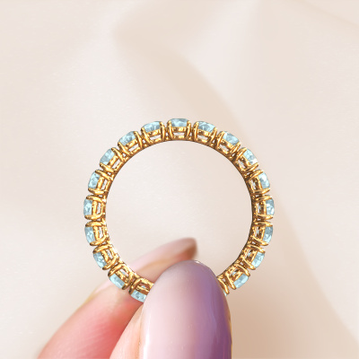 Das ist unser Vivienne 2.9-Ring. Dieser spezielle Typ wird als Eternity ring bezeichnet und ist mit einer durchgehenden Linie von identisch geschliffenen Edelsteinen besetzt. Er ist aus 14 Karat Gold und mit kleineren Aquamarin 2.9 mm besetzt. Dieser Gold Eternity Ring ist eine wunderschöne und sinnvolle Möglichkeit, Ihrem Antrag eine besondere Note zu verleihen. Die herrlich gleichmäßig geformten Aquamarins sind rund um den Ring eingefasst. Die identischen Aquamarins werden sorgfältig ausgewählt, um dem Ring eine maximale Wirkung zu verleihen. Denken Sie daran, dass wir natürliche Ressourcen verwenden. Daher sind kleine Unterschiede zwischen den Steinen üblich. Der besondere Effekt wird durch die präzise Positionierung der Aquamarins noch verstärkt. Dies erfordert äußerste Präzision und eine geschickte Hand. Für unsere erfahrenen Juweliere ist die pure Leidenschaft. Am Ende bekommen Sie einen Ring mit einer Reihe von Aquamarins, die weder Anfang noch Ende zu haben scheinen. Das perfekte Symbol für Ihre Liebe zu ihr! Ist sie nicht eine Schönheit? Mit unserer modernen Technik können wir Schmuckstücke von höchster Qualität mit größter Sorgfalt für Sie entwerfen und anpassen. Unsere Ringe sind immer um 30 Prozent günstiger als bei anderen Juwelieren. Wir fertigen Ringe auf Bestellung, also müssen wir keine großen Lager unterhalten. Wenn Sie ein bestimmtes Budget haben, beraten wir Sie gerne entsprechend.Unsere Online-Kollektion wird täglich um neue Schmuckdesigns ergänzt. Unser Team von leidenschaftlichen Designern ist bemüht, außergewöhnliche und vielfältige Designs zu kreieren. Haben Sie einen Ring gesehen, der Ihnen gefällt? Setzen Sie sich mit uns in Verbindung. Basierend auf einem guten Preis/Leistungsverhältnis machen wir Ihnen ein Angebot, das Sie nicht ablehnen können!Um es einfacher zu machen, bieten wir eine kostenlose 30-tägige Rücksendung.