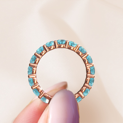 Das ist unser Heddy rnd 3.7-Ring. Dieser spezielle Typ wird als Eternity ring bezeichnet und ist mit einer durchgehenden Linie von identisch geschliffenen Edelsteinen besetzt. Er ist aus 14 Karat Roségold und mit kleineren Blau Topas 3.7 mm besetzt. Dieser Roségold Eternity Ring ist eine wunderschöne und sinnvolle Möglichkeit, Ihrem Antrag eine besondere Note zu verleihen. Die herrlich gleichmäßig geformten Blaue Topas sind rund um den Ring eingefasst. Die identischen Blaue Topas werden sorgfältig ausgewählt, um dem Ring eine maximale Wirkung zu verleihen. Denken Sie daran, dass wir natürliche Ressourcen verwenden. Daher sind kleine Unterschiede zwischen den Steinen üblich. Der besondere Effekt wird durch die präzise Positionierung der Blaue Topas noch verstärkt. Dies erfordert äußerste Präzision und eine geschickte Hand. Für unsere erfahrenen Juweliere ist die pure Leidenschaft. Am Ende bekommen Sie einen Vorsteckring mit einer Reihe von Blaue Topas, die weder Anfang noch Ende zu haben scheinen. Das perfekte Symbol für Ihre Liebe zu ihr! Ist sie nicht eine Schönheit? Mit unserer modernen Technik können wir Schmuckstücke von höchster Qualität mit größter Sorgfalt für Sie entwerfen und anpassen. Unsere Ringe sind immer um 30 Prozent günstiger als bei anderen Juwelieren. Wir fertigen Ringe auf Bestellung, also müssen wir keine großen Lager unterhalten. Wenn Sie ein bestimmtes Budget haben, beraten wir Sie gerne entsprechend.Unsere Online-Kollektion wird täglich um neue Schmuckdesigns ergänzt. Unser Team von leidenschaftlichen Designern ist bemüht, außergewöhnliche und vielfältige Designs zu kreieren. Haben Sie einen Ring gesehen, der Ihnen gefällt? Setzen Sie sich mit uns in Verbindung. Basierend auf einem guten Preis/Leistungsverhältnis machen wir Ihnen ein Angebot, das Sie nicht ablehnen können!Um es einfacher zu machen, bieten wir eine kostenlose 30-tägige Rücksendung.