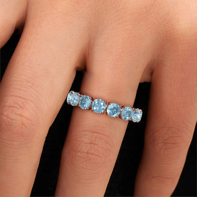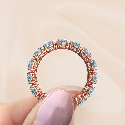 Das ist unser Vivienne 4.2-Ring. Dieser spezielle Typ wird als Eternity ring bezeichnet und ist mit einer durchgehenden Linie von identisch geschliffenen Edelsteinen besetzt. Er ist aus 14 Karat Roségold und mit kleineren blauer Labordiamant 4.2 mm besetzt. Dieser Roségold Eternity Ring ist eine wunderschöne und sinnvolle Möglichkeit, Ihrem Antrag eine besondere Note zu verleihen. Die herrlich gleichmäßig geformten blauer Labordiamanten sind rund um den Ring eingefasst. Die identischen blauer Labordiamanten werden sorgfältig ausgewählt, um dem Ring eine maximale Wirkung zu verleihen. Denken Sie daran, dass wir natürliche Ressourcen verwenden. Daher sind kleine Unterschiede zwischen den Steinen üblich. Der besondere Effekt wird durch die präzise Positionierung der blauer Labordiamanten noch verstärkt. Dies erfordert äußerste Präzision und eine geschickte Hand. Für unsere erfahrenen Juweliere ist die pure Leidenschaft. Am Ende bekommen Sie einen Ring mit einer Reihe von blauer Labordiamanten, die weder Anfang noch Ende zu haben scheinen. Das perfekte Symbol für Ihre Liebe zu ihr! Ist sie nicht eine Schönheit?