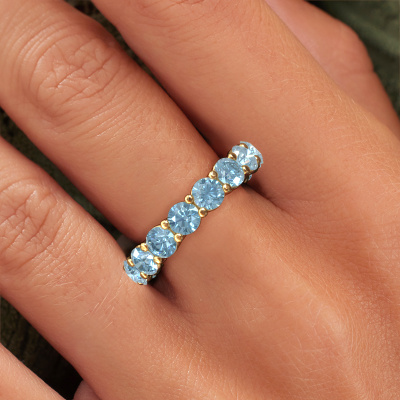 Das ist unser Michelle full 4.2-Ring. Dieser spezielle Typ wird als Eternity ring bezeichnet und ist mit einer durchgehenden Linie von identisch geschliffenen Edelsteinen besetzt. Er ist aus 14 Karat Gold und mit kleineren blauer Labordiamant 4.2 mm besetzt. Dieser Gold Eternity Ring ist eine wunderschöne und sinnvolle Möglichkeit, Ihrem Antrag eine besondere Note zu verleihen. Die herrlich gleichmäßig geformten blauer Labordiamanten sind rund um den Ring eingefasst. Die identischen blauer Labordiamanten werden sorgfältig ausgewählt, um dem Ring eine maximale Wirkung zu verleihen. Denken Sie daran, dass wir natürliche Ressourcen verwenden. Daher sind kleine Unterschiede zwischen den Steinen üblich. Der besondere Effekt wird durch die präzise Positionierung der blauer Labordiamanten noch verstärkt. Dies erfordert äußerste Präzision und eine geschickte Hand. Für unsere erfahrenen Juweliere ist die pure Leidenschaft. Am Ende bekommen Sie einen Vorsteckring mit einer Reihe von blauer Labordiamanten, die weder Anfang noch Ende zu haben scheinen. Das perfekte Symbol für Ihre Liebe zu ihr! Ist sie nicht eine Schönheit?