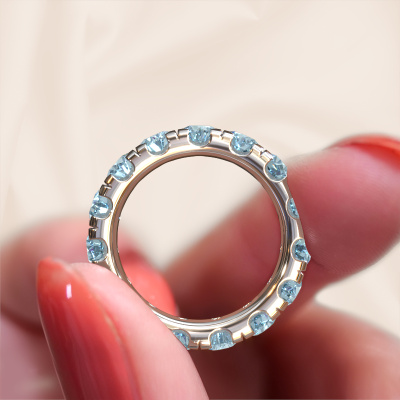 Das ist unser Jackie 4.2-Ring. Dieser spezielle Typ wird als Eternity ring bezeichnet und ist mit einer durchgehenden Linie von identisch geschliffenen Edelsteinen besetzt. Er ist aus 14 Karat Weißgold und mit kleineren blauer Labordiamant 4.2 mm besetzt. Dieser Weißgold Eternity Ring ist eine wunderschöne und sinnvolle Möglichkeit, Ihrem Antrag eine besondere Note zu verleihen. Die herrlich gleichmäßig geformten blauer Labordiamanten sind rund um den Ring eingefasst. Die identischen blauer Labordiamanten werden sorgfältig ausgewählt, um dem Ring eine maximale Wirkung zu verleihen. Denken Sie daran, dass wir natürliche Ressourcen verwenden. Daher sind kleine Unterschiede zwischen den Steinen üblich. Der besondere Effekt wird durch die präzise Positionierung der blauer Labordiamanten noch verstärkt. Dies erfordert äußerste Präzision und eine geschickte Hand. Für unsere erfahrenen Juweliere ist die pure Leidenschaft. Am Ende bekommen Sie einen Vorsteckring mit einer Reihe von blauer Labordiamanten, die weder Anfang noch Ende zu haben scheinen. Das perfekte Symbol für Ihre Liebe zu ihr! Ist sie nicht eine Schönheit?