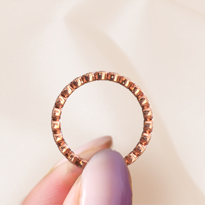 Das ist unser Mariam 0.03-Ring. Dieser spezielle Typ wird als Eternity ring bezeichnet und ist mit einer durchgehenden Linie von identisch geschliffenen Edelsteinen besetzt. Er ist aus 14 Karat Roségold und mit kleineren Braun Diamant 0.03 crt besetzt. Dieser Roségold Eternity Ring ist eine wunderschöne und sinnvolle Möglichkeit, Ihrem Antrag eine besondere Note zu verleihen. Die herrlich gleichmäßig geformten Braune Diamanten sind rund um den Ring eingefasst. Die identischen Braune Diamanten werden sorgfältig ausgewählt, um dem Ring eine maximale Wirkung zu verleihen. Denken Sie daran, dass wir natürliche Ressourcen verwenden. Daher sind kleine Unterschiede zwischen den Steinen üblich. Der besondere Effekt wird durch die präzise Positionierung der Braune Diamanten noch verstärkt. Dies erfordert äußerste Präzision und eine geschickte Hand. Für unsere erfahrenen Juweliere ist die pure Leidenschaft. Am Ende bekommen Sie einen Ring mit einer Reihe von Braune Diamanten, die weder Anfang noch Ende zu haben scheinen. Das perfekte Symbol für Ihre Liebe zu ihr! Ist sie nicht eine Schönheit? Da wir unsere eigenen Ringe entwerfen und liefern, können wir Ihnen einen Ring zu einem Preis anbieten, den Sie nirgendwo anders finden. Ein Ring wird auf Bestellung angefertigt, wodurch kein überschüssiges Material anfällt. So können wir Ihnen ein gutes Angebot zum besten Preis machen. Wir verstehen, dass es sich riskant anfühlt, Ihren Ring online zu kaufen. Jedoch helfen wir Ihnen gerne beim Designprozess unter Berücksichtigung Ihres Budgets.Unser Team von talentierten, leidenschaftlichen Designern fügt unserer Online-Kollektion täglich neue Ringe-Designs hinzu. Unser Ziel dabei ist es, Ihnen eine große Vielfalt an Schmuckstücken anbieten zu können. Bitte zögern Sie nicht, ein Angebot anzufordern, wenn Sie spezielle Wünsche für Ihren Ring haben. Wir garantieren Ihnen ein Angebot, das Sie nicht ablehnen können.Um es einfacher zu machen, bieten wir eine kostenlose 30-tägige Rücksendung.