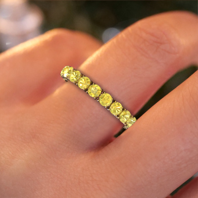 Das ist unser Vivienne 2.9-Ring. Dieser spezielle Typ wird als Eternity ring bezeichnet und ist mit einer durchgehenden Linie von identisch geschliffenen Edelsteinen besetzt. Er ist aus 14 Karat Gold und mit kleineren Gelb Saphir 2.9 mm besetzt. Dieser Gold Eternity Ring ist eine wunderschöne und sinnvolle Möglichkeit, Ihrem Antrag eine besondere Note zu verleihen. Die herrlich gleichmäßig geformten Gelb Saphir sind rund um den Ring eingefasst. Die identischen Gelb Saphir werden sorgfältig ausgewählt, um dem Ring eine maximale Wirkung zu verleihen. Denken Sie daran, dass wir natürliche Ressourcen verwenden. Daher sind kleine Unterschiede zwischen den Steinen üblich. Der besondere Effekt wird durch die präzise Positionierung der Gelb Saphir noch verstärkt. Dies erfordert äußerste Präzision und eine geschickte Hand. Für unsere erfahrenen Juweliere ist die pure Leidenschaft. Am Ende bekommen Sie einen Ring mit einer Reihe von Gelb Saphir, die weder Anfang noch Ende zu haben scheinen. Das perfekte Symbol für Ihre Liebe zu ihr! Ist sie nicht eine Schönheit? Mit unserer modernen Technik können wir Schmuckstücke von höchster Qualität mit größter Sorgfalt für Sie entwerfen und anpassen. Unsere Ringe sind immer um 30 Prozent günstiger als bei anderen Juwelieren. Wir fertigen Ringe auf Bestellung, also müssen wir keine großen Lager unterhalten. Wenn Sie ein bestimmtes Budget haben, beraten wir Sie gerne entsprechend.Unsere Online-Kollektion wird täglich um neue Schmuckdesigns ergänzt. Unser Team von leidenschaftlichen Designern ist bemüht, außergewöhnliche und vielfältige Designs zu kreieren. Haben Sie einen Ring gesehen, der Ihnen gefällt? Setzen Sie sich mit uns in Verbindung. Basierend auf einem guten Preis/Leistungsverhältnis machen wir Ihnen ein Angebot, das Sie nicht ablehnen können!Um es einfacher zu machen, bieten wir eine kostenlose 30-tägige Rücksendung.