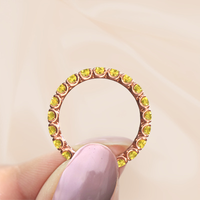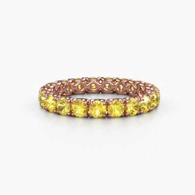 Das ist unser Estee 2.9-Ring. Dieser spezielle Typ wird als Eternity ring bezeichnet und ist mit einer durchgehenden Linie von identisch geschliffenen Edelsteinen besetzt. Er ist aus 14 Karat Roségold und mit kleineren Gelb Saphir 2.9 mm besetzt. Dieser Roségold Eternity Ring ist eine wunderschöne und sinnvolle Möglichkeit, Ihrem Antrag eine besondere Note zu verleihen. Die herrlich gleichmäßig geformten Gelb Saphir sind rund um den Ring eingefasst. Die identischen Gelb Saphir werden sorgfältig ausgewählt, um dem Ring eine maximale Wirkung zu verleihen. Denken Sie daran, dass wir natürliche Ressourcen verwenden. Daher sind kleine Unterschiede zwischen den Steinen üblich. Der besondere Effekt wird durch die präzise Positionierung der Gelb Saphir noch verstärkt. Dies erfordert äußerste Präzision und eine geschickte Hand. Für unsere erfahrenen Juweliere ist die pure Leidenschaft. Am Ende bekommen Sie einen Vorsteckring mit einer Reihe von Gelb Saphir, die weder Anfang noch Ende zu haben scheinen. Das perfekte Symbol für Ihre Liebe zu ihr! Ist sie nicht eine Schönheit? Da wir unsere eigenen Ringe entwerfen und liefern, können wir Ihnen einen Ring zu einem Preis anbieten, den Sie nirgendwo anders finden. Ein Ring wird auf Bestellung angefertigt, wodurch kein überschüssiges Material anfällt. So können wir Ihnen ein gutes Angebot zum besten Preis machen. Wir verstehen, dass es sich riskant anfühlt, Ihren Ring online zu kaufen. Jedoch helfen wir Ihnen gerne beim Designprozess unter Berücksichtigung Ihres Budgets.Unser Team von talentierten, leidenschaftlichen Designern fügt unserer Online-Kollektion täglich neue Ringe-Designs hinzu. Unser Ziel dabei ist es, Ihnen eine große Vielfalt an Schmuckstücken anbieten zu können. Bitte zögern Sie nicht, ein Angebot anzufordern, wenn Sie spezielle Wünsche für Ihren Ring haben. Wir garantieren Ihnen ein Angebot, das Sie nicht ablehnen können.Um es einfacher zu machen, bieten wir eine kostenlose 30-tägige Rücksendung.