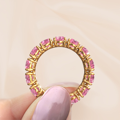 Das ist unser Vivienne 4.7-Ring. Dieser spezielle Typ wird als eternity Ring bezeichnet und ist mit einer durchgehenden Linie von identisch geschliffenen Edelsteinen besetzt. Er ist aus 14 Karat Gold und mit kleineren 4.7 mm Pink Saphir besetzt. Die erstaunlichen Pink Saphir sind identisch in der Größe und im Ringband platziert. Unsere Pink Saphir werden sorgfältig ausgewählt, damit sie identisch sind und somit das beste Ergebnis erzielen. Um das beste Ergebnis zu erzielen, positioniert unser Juwelier alle Pink Saphir von Hand und mit größter Sorgfalt. Unsere Juweliere haben nur ein Ziel, nämlich den perfekten Ring zu kreieren. Deshalb lieben wir, was wir tun. Am Ende bekommen Sie einen atemberaubenden, exklusive Gold Ring mit einer Reihe von Pink Saphir, die weder Anfang noch Ende zu haben scheinen. Das perfekte Symbol für Ihre unsterbliche Liebe zu ihr! Ist sie nicht eine Schönheit? Nach Erhalt Ihrer Bestellung beginnen unsere Goldschmiede mit Leidenschaft den kreativen Prozess und fertigen Ihren Ring in unserem eigenen Studio. Da wir keine großen Lager haben, werden diese Kosten nicht an Sie weitergegeben. Unsere Preisgestaltung ist der Beweis dafür! Wir bieten Schmuck zum niedrigsten Preis, garantiert.Unsere talentierten, leidenschaftlichen Designer fügen unserer Online-Kollektion täglich neue Designs hinzu. Zusammen versuchen sie, eine vielfältige Kollektion feinster Schmuckstücke zu erstellen. Wenn Sie es vorziehen, einen Ring nach Ihrem eigenen Entwurf zu machen, können Sie gerne ein Angebot anfordern. Wir machen Ihnen ein großartiges Angebot, basierend auf Qualität und Preis.Um es einfacher zu machen, bieten wir eine kostenlose 30-tägige Rücksendung.