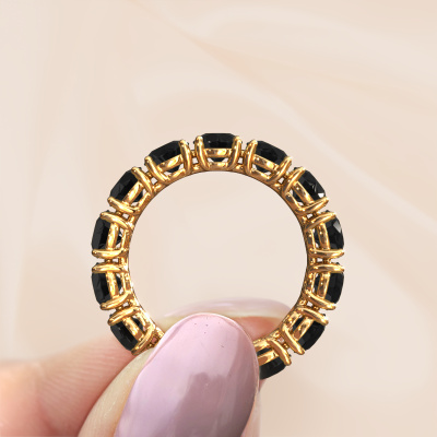 Das ist unser Vivienne 4.7-Ring. Dieser spezielle Typ wird als eternity Ring bezeichnet und ist mit einer durchgehenden Linie von identisch geschliffenen Edelsteinen besetzt. Er ist aus 14 Karat Gold und mit kleineren 0.48 crt Schwarze Diamanten besetzt. Die erstaunlichen Schwarze Diamanten sind identisch in der Größe und im Ringband platziert. Unsere Schwarze Diamanten werden sorgfältig ausgewählt, damit sie identisch sind und somit das beste Ergebnis erzielen. Um das beste Ergebnis zu erzielen, positioniert unser Juwelier alle Schwarze Diamanten von Hand und mit größter Sorgfalt. Unsere Juweliere haben nur ein Ziel, nämlich den perfekten Ring zu kreieren. Deshalb lieben wir, was wir tun. Am Ende bekommen Sie einen atemberaubenden, exklusive Gold Ring mit einer Reihe von Schwarze Diamanten, die weder Anfang noch Ende zu haben scheinen. Das perfekte Symbol für Ihre unsterbliche Liebe zu ihr! Ist sie nicht eine Schönheit? Nach Erhalt Ihrer Bestellung beginnen unsere Goldschmiede mit Leidenschaft den kreativen Prozess und fertigen Ihren Ring in unserem eigenen Studio. Da wir keine großen Lager haben, werden diese Kosten nicht an Sie weitergegeben. Unsere Preisgestaltung ist der Beweis dafür! Wir bieten Schmuck zum niedrigsten Preis, garantiert.Unsere talentierten, leidenschaftlichen Designer fügen unserer Online-Kollektion täglich neue Designs hinzu. Zusammen versuchen sie, eine vielfältige Kollektion feinster Schmuckstücke zu erstellen. Wenn Sie es vorziehen, einen Ring nach Ihrem eigenen Entwurf zu machen, können Sie gerne ein Angebot anfordern. Wir machen Ihnen ein großartiges Angebot, basierend auf Qualität und Preis.Um es einfacher zu machen, bieten wir eine kostenlose 30-tägige Rücksendung.