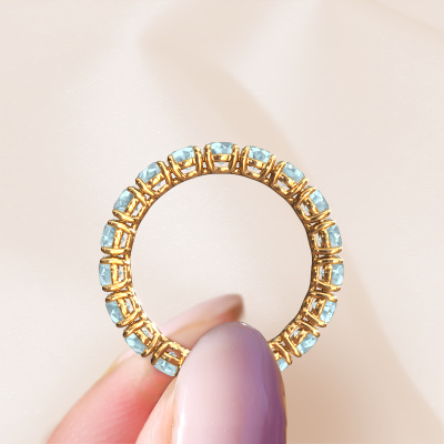 Das ist unser Vivienne 3.4-Ring. Dieser spezielle Typ wird als eternity Ring bezeichnet und ist mit einer durchgehenden Linie von identisch geschliffenen Edelsteinen besetzt. Er ist aus 14 Karat Gold und mit kleineren 3.4 mm Aquamarins besetzt. Die erstaunlichen Aquamarins sind identisch in der Größe und im Ringband platziert. Unsere Aquamarins werden sorgfältig ausgewählt, damit sie identisch sind und somit das beste Ergebnis erzielen. Um das beste Ergebnis zu erzielen, positioniert unser Juwelier alle Aquamarins von Hand und mit größter Sorgfalt. Unsere Juweliere haben nur ein Ziel, nämlich den perfekten Ring zu kreieren. Deshalb lieben wir, was wir tun. Am Ende bekommen Sie einen atemberaubenden, klassische Gold Vorsteckring mit einer Reihe von Aquamarins, die weder Anfang noch Ende zu haben scheinen. Das perfekte Symbol für Ihre unsterbliche Liebe zu ihr! Ist sie nicht eine Schönheit? Haben Sie ein bestimmtes Budget? Sie können uns gerne kontaktieren, damit wir Ihre Optionen besprechen können. Wir bieten unsere Ringe zum garantiert besten Preis, denn wir fertigen sie auf Bestellung. Solche Preise finden Sie nirgendwo anders!Unser Team von talentierten, leidenschaftlichen Designern fügt unserer Online-Kollektion täglich neue Ring-Designs hinzu. Unser Ziel dabei ist es, Ihnen eine große Vielfalt an Schmuckstücken anbieten zu können. Bitte zögern Sie nicht, ein Angebot anzufordern, wenn Sie spezielle Wünsche für Ihren Ring haben. Wir garantieren Ihnen ein Angebot, das Sie nicht ablehnen können.Um es einfacher zu machen, bieten wir eine kostenlose 30-tägige Rücksendung.