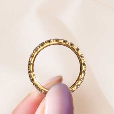 Das ist unser Jackie 2.7-Ring. Dieser spezielle Typ wird als eternity Ring bezeichnet und ist mit einer durchgehenden Linie von identisch geschliffenen Edelsteinen besetzt. Er ist aus 14 Karat Gold und mit kleineren 0.08 crt Braune Diamanten besetzt. Die erstaunlichen Braune Diamanten sind identisch in der Größe und im Ringband platziert. Unsere Braune Diamanten werden sorgfältig ausgewählt, damit sie identisch sind und somit das beste Ergebnis erzielen. Um das beste Ergebnis zu erzielen, positioniert unser Juwelier alle Braune Diamanten von Hand und mit größter Sorgfalt. Unsere Juweliere haben nur ein Ziel, nämlich den perfekten Ring zu kreieren. Deshalb lieben wir, was wir tun. Am Ende bekommen Sie einen atemberaubenden, moderne Gold Vorsteckring mit einer Reihe von Braune Diamanten, die weder Anfang noch Ende zu haben scheinen. Das perfekte Symbol für Ihre unsterbliche Liebe zu ihr! Ist sie nicht eine Schönheit? Da wir unsere eigenen Ringe entwerfen und liefern, können wir Ihnen einen Ring zu einem Preis anbieten, den Sie nirgendwo anders finden. Ein Ring wird auf Bestellung angefertigt, wodurch kein überschüssiges Material anfällt. So können wir Ihnen ein gutes Angebot zum besten Preis machen. Wir verstehen, dass es sich riskant anfühlt, Ihren Ring online zu kaufen. Jedoch helfen wir Ihnen gerne beim Designprozess unter Berücksichtigung Ihres Budgets.Unser Team von talentierten, leidenschaftlichen Designern fügt unserer Online-Kollektion täglich neue Ringe-Designs hinzu. Unser Ziel dabei ist es, Ihnen eine große Vielfalt an Schmuckstücken anbieten zu können. Bitte zögern Sie nicht, ein Angebot anzufordern, wenn Sie spezielle Wünsche für Ihren Ring haben. Wir garantieren Ihnen ein Angebot, das Sie nicht ablehnen können.Um es einfacher zu machen, bieten wir eine kostenlose 30-tägige Rücksendung.