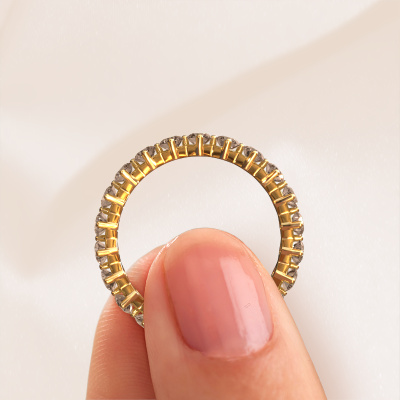Das ist unser Janie 2.7mm-Ring. Dieser spezielle Typ wird als eternity Ring bezeichnet und ist mit einer durchgehenden Linie von identisch geschliffenen Edelsteinen besetzt. Er ist aus 14 Karat Gold und mit kleineren 0.08 crt Braune Diamanten besetzt. Die erstaunlichen Braune Diamanten sind identisch in der Größe und im Ringband platziert. Unsere Braune Diamanten werden sorgfältig ausgewählt, damit sie identisch sind und somit das beste Ergebnis erzielen. Um das beste Ergebnis zu erzielen, positioniert unser Juwelier alle Braune Diamanten von Hand und mit größter Sorgfalt. Unsere Juweliere haben nur ein Ziel, nämlich den perfekten Ring zu kreieren. Deshalb lieben wir, was wir tun. Am Ende bekommen Sie einen atemberaubenden, trendige Gold Vorsteckring mit einer Reihe von Braune Diamanten, die weder Anfang noch Ende zu haben scheinen. Das perfekte Symbol für Ihre unsterbliche Liebe zu ihr! Ist sie nicht eine Schönheit? Durch die Kombination modernster Technik mit uralter Handwerkskunst können wir alle Ringe in unserem eigenen Studio anfertigen. Jedes Schmuckstück wird auf Anfrage gefertigt. Das ist vorteilhaft, weil wir Ihnen dadurch einen Preis anbieten können, den Sie nirgendwo anders finden.