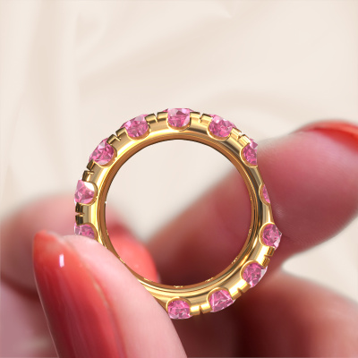 Das ist unser Jackie 4.7-Ring. Dieser spezielle Typ wird als eternity Ring bezeichnet und ist mit einer durchgehenden Linie von identisch geschliffenen Edelsteinen besetzt. Er ist aus 14 Karat Gold und mit kleineren 4.7 mm Pink Saphir besetzt. Die erstaunlichen Pink Saphir sind identisch in der Größe und im Ringband platziert. Unsere Pink Saphir werden sorgfältig ausgewählt, damit sie identisch sind und somit das beste Ergebnis erzielen. Um das beste Ergebnis zu erzielen, positioniert unser Juwelier alle Pink Saphir von Hand und mit größter Sorgfalt. Unsere Juweliere haben nur ein Ziel, nämlich den perfekten Ring zu kreieren. Deshalb lieben wir, was wir tun. Am Ende bekommen Sie einen atemberaubenden, exklusive Gold Vorsteckring mit einer Reihe von Pink Saphir, die weder Anfang noch Ende zu haben scheinen. Das perfekte Symbol für Ihre unsterbliche Liebe zu ihr! Ist sie nicht eine Schönheit? Da wir unsere eigenen Ringe entwerfen und liefern, können wir Ihnen einen Ring zu einem Preis anbieten, den Sie nirgendwo anders finden. Ein Ring wird auf Bestellung angefertigt, wodurch kein überschüssiges Material anfällt. So können wir Ihnen ein gutes Angebot zum besten Preis machen. Wir verstehen, dass es sich riskant anfühlt, Ihren Ring online zu kaufen. Jedoch helfen wir Ihnen gerne beim Designprozess unter Berücksichtigung Ihres Budgets.Unser Team von talentierten, leidenschaftlichen Designern fügt unserer Online-Kollektion täglich neue Ringe-Designs hinzu. Unser Ziel dabei ist es, Ihnen eine große Vielfalt an Schmuckstücken anbieten zu können. Bitte zögern Sie nicht, ein Angebot anzufordern, wenn Sie spezielle Wünsche für Ihren Ring haben. Wir garantieren Ihnen ein Angebot, das Sie nicht ablehnen können.Um es einfacher zu machen, bieten wir eine kostenlose 30-tägige Rücksendung.