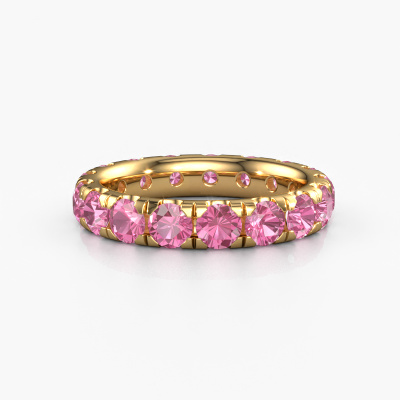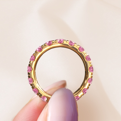 Das ist unser Jackie 3.7-Ring. Dieser spezielle Typ wird als eternity Ring bezeichnet und ist mit einer durchgehenden Linie von identisch geschliffenen Edelsteinen besetzt. Er ist aus 14 Karat Gold und mit kleineren 3.7 mm Pink Saphir besetzt. Die erstaunlichen Pink Saphir sind identisch in der Größe und im Ringband platziert. Unsere Pink Saphir werden sorgfältig ausgewählt, damit sie identisch sind und somit das beste Ergebnis erzielen. Um das beste Ergebnis zu erzielen, positioniert unser Juwelier alle Pink Saphir von Hand und mit größter Sorgfalt. Unsere Juweliere haben nur ein Ziel, nämlich den perfekten Ring zu kreieren. Deshalb lieben wir, was wir tun. Am Ende bekommen Sie einen atemberaubenden, moderne Gold Vorsteckring mit einer Reihe von Pink Saphir, die weder Anfang noch Ende zu haben scheinen. Das perfekte Symbol für Ihre unsterbliche Liebe zu ihr! Ist sie nicht eine Schönheit? Mit unserer modernen Technik können wir Schmuckstücke von höchster Qualität mit größter Sorgfalt für Sie entwerfen und anpassen. Unsere Ringe sind immer um 30 Prozent günstiger als bei anderen Juwelieren. Wir fertigen Ringe auf Bestellung, also müssen wir keine großen Lager unterhalten. Wenn Sie ein bestimmtes Budget haben, beraten wir Sie gerne entsprechend.Unsere Online-Kollektion wird täglich um neue Schmuckdesigns ergänzt. Unser Team von leidenschaftlichen Designern ist bemüht, außergewöhnliche und vielfältige Designs zu kreieren. Haben Sie einen Ring gesehen, der Ihnen gefällt? Setzen Sie sich mit uns in Verbindung. Basierend auf einem guten Preis/Leistungsverhältnis machen wir Ihnen ein Angebot, das Sie nicht ablehnen können!Um es einfacher zu machen, bieten wir eine kostenlose 30-tägige Rücksendung.