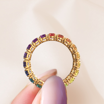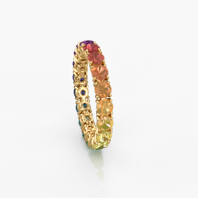 Das ist unser Vivienne 3.4-Ring. Dieser spezielle Typ wird als eternity Ring bezeichnet und ist mit einer durchgehenden Linie von identisch geschliffenen Edelsteinen besetzt. Er ist aus 14 Karat Gold und mit kleineren 3.4 mm Rainbow Saphir 1 besetzt. Die erstaunlichen Rainbow Saphir 1 sind identisch in der Größe und im Ringband platziert. Unsere Rainbow Saphir 1 werden sorgfältig ausgewählt, damit sie identisch sind und somit das beste Ergebnis erzielen. Um das beste Ergebnis zu erzielen, positioniert unser Juwelier alle Rainbow Saphir 1 von Hand und mit größter Sorgfalt. Unsere Juweliere haben nur ein Ziel, nämlich den perfekten Ring zu kreieren. Deshalb lieben wir, was wir tun. Am Ende bekommen Sie einen atemberaubenden, klassische Gold Vorsteckring mit einer Reihe von Rainbow Saphir 1, die weder Anfang noch Ende zu haben scheinen. Das perfekte Symbol für Ihre unsterbliche Liebe zu ihr! Ist sie nicht eine Schönheit? Haben Sie ein bestimmtes Budget? Sie können uns gerne kontaktieren, damit wir Ihre Optionen besprechen können. Wir bieten unsere Ringe zum garantiert besten Preis, denn wir fertigen sie auf Bestellung. Solche Preise finden Sie nirgendwo anders!Unser Team von talentierten, leidenschaftlichen Designern fügt unserer Online-Kollektion täglich neue Ring-Designs hinzu. Unser Ziel dabei ist es, Ihnen eine große Vielfalt an Schmuckstücken anbieten zu können. Bitte zögern Sie nicht, ein Angebot anzufordern, wenn Sie spezielle Wünsche für Ihren Ring haben. Wir garantieren Ihnen ein Angebot, das Sie nicht ablehnen können.Um es einfacher zu machen, bieten wir eine kostenlose 30-tägige Rücksendung.