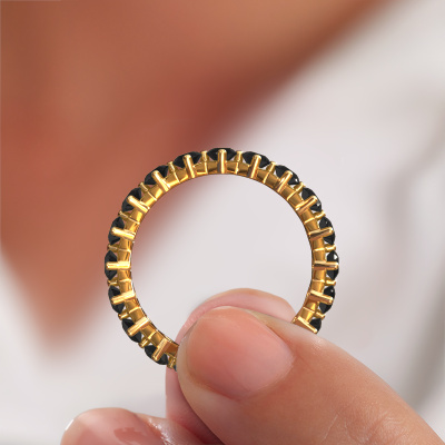 Das ist unser Janie 3.0mm-Ring. Dieser spezielle Typ wird als eternity Ring bezeichnet und ist mit einer durchgehenden Linie von identisch geschliffenen Edelsteinen besetzt. Er ist aus 14 Karat Gold und mit kleineren 0.12 crt Schwarze Diamanten besetzt. Die erstaunlichen Schwarze Diamanten sind identisch in der Größe und im Ringband platziert. Unsere Schwarze Diamanten werden sorgfältig ausgewählt, damit sie identisch sind und somit das beste Ergebnis erzielen. Um das beste Ergebnis zu erzielen, positioniert unser Juwelier alle Schwarze Diamanten von Hand und mit größter Sorgfalt. Unsere Juweliere haben nur ein Ziel, nämlich den perfekten Ring zu kreieren. Deshalb lieben wir, was wir tun. Am Ende bekommen Sie einen atemberaubenden, Fantasie Gold Vorsteckring mit einer Reihe von Schwarze Diamanten, die weder Anfang noch Ende zu haben scheinen. Das perfekte Symbol für Ihre unsterbliche Liebe zu ihr! Ist sie nicht eine Schönheit? Durch die Kombination modernster Technik mit uralter Handwerkskunst können wir alle Ringe in unserem eigenen Studio anfertigen. Jedes Schmuckstück wird auf Anfrage gefertigt. Das ist vorteilhaft, weil wir Ihnen dadurch einen Preis anbieten können, den Sie nirgendwo anders finden.