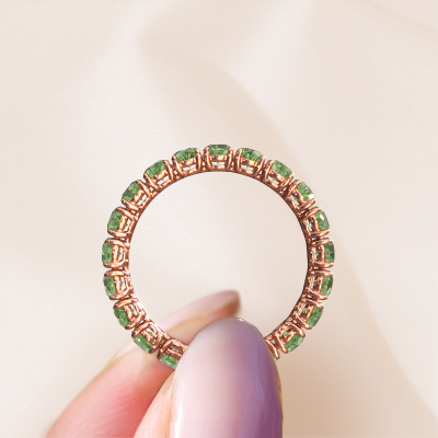 Das ist unser Vivienne 2.9-Ring. Dieser spezielle Typ wird als Eternity ring bezeichnet und ist mit einer durchgehenden Linie von identisch geschliffenen Edelsteinen besetzt. Er ist aus 14 Karat Roségold und mit kleineren Turmalin grün 2.9 mm besetzt. Dieser Roségold Eternity Ring ist eine wunderschöne und sinnvolle Möglichkeit, Ihrem Antrag eine besondere Note zu verleihen. Die herrlich gleichmäßig geformten grüner Turmalin sind rund um den Ring eingefasst. Die identischen grüner Turmalin werden sorgfältig ausgewählt, um dem Ring eine maximale Wirkung zu verleihen. Denken Sie daran, dass wir natürliche Ressourcen verwenden. Daher sind kleine Unterschiede zwischen den Steinen üblich. Der besondere Effekt wird durch die präzise Positionierung der grüner Turmalin noch verstärkt. Dies erfordert äußerste Präzision und eine geschickte Hand. Für unsere erfahrenen Juweliere ist die pure Leidenschaft. Am Ende bekommen Sie einen Ring mit einer Reihe von grüner Turmalin, die weder Anfang noch Ende zu haben scheinen. Das perfekte Symbol für Ihre Liebe zu ihr! Ist sie nicht eine Schönheit? Mit unserer modernen Technik können wir Schmuckstücke von höchster Qualität mit größter Sorgfalt für Sie entwerfen und anpassen. Unsere Ringe sind immer um 30 Prozent günstiger als bei anderen Juwelieren. Wir fertigen Ringe auf Bestellung, also müssen wir keine großen Lager unterhalten. Wenn Sie ein bestimmtes Budget haben, beraten wir Sie gerne entsprechend.Unsere Online-Kollektion wird täglich um neue Schmuckdesigns ergänzt. Unser Team von leidenschaftlichen Designern ist bemüht, außergewöhnliche und vielfältige Designs zu kreieren. Haben Sie einen Ring gesehen, der Ihnen gefällt? Setzen Sie sich mit uns in Verbindung. Basierend auf einem guten Preis/Leistungsverhältnis machen wir Ihnen ein Angebot, das Sie nicht ablehnen können!Um es einfacher zu machen, bieten wir eine kostenlose 30-tägige Rücksendung.