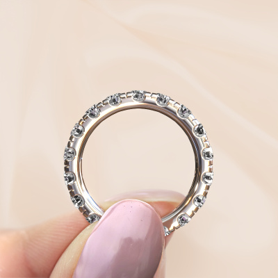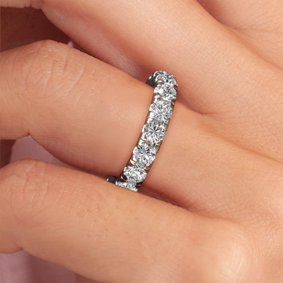 Das ist unser Jackie 3.4-Ring. Dieser spezielle Typ wird als Eternity ring bezeichnet und ist mit einer durchgehenden Linie von identisch geschliffenen Edelsteinen besetzt. Er ist aus 14 Karat Weißgold und mit kleineren Lab-grown Diamant 0.15 crt besetzt. Dieser Weißgold Eternity Ring ist eine wunderschöne und sinnvolle Möglichkeit, Ihrem Antrag eine besondere Note zu verleihen. Die herrlich gleichmäßig geformten Lab grown Diamant sind rund um den Ring eingefasst. Die identischen Lab grown Diamant werden sorgfältig ausgewählt, um dem Ring eine maximale Wirkung zu verleihen. Denken Sie daran, dass wir natürliche Ressourcen verwenden. Daher sind kleine Unterschiede zwischen den Steinen üblich. Der besondere Effekt wird durch die präzise Positionierung der Lab grown Diamant noch verstärkt. Dies erfordert äußerste Präzision und eine geschickte Hand. Für unsere erfahrenen Juweliere ist die pure Leidenschaft. Am Ende bekommen Sie einen Vorsteckring mit einer Reihe von Lab grown Diamant, die weder Anfang noch Ende zu haben scheinen. Das perfekte Symbol für Ihre Liebe zu ihr! Ist sie nicht eine Schönheit? Nach Erhalt Ihrer Bestellung beginnen unsere Goldschmiede mit Leidenschaft den kreativen Prozess und fertigen Ihren Ring in unserem eigenen Studio. Da wir keine großen Lager haben, werden diese Kosten nicht an Sie weitergegeben. Unsere Preisgestaltung ist der Beweis dafür! Wir bieten Schmuck zum niedrigsten Preis, garantiert.Unsere talentierten, leidenschaftlichen Designer fügen unserer Online-Kollektion täglich neue Designs hinzu. Zusammen versuchen sie, eine vielfältige Kollektion feinster Schmuckstücke zu erstellen. Wenn Sie es vorziehen, einen Ring nach Ihrem eigenen Entwurf zu machen, können Sie gerne ein Angebot anfordern. Wir machen Ihnen ein großartiges Angebot, basierend auf Qualität und Preis.Um es einfacher zu machen, bieten wir eine kostenlose 30-tägige Rücksendung.