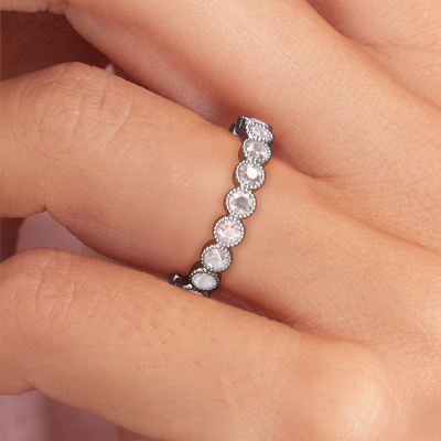 Das ist unser Mariam 0.05-Ring. Dieser spezielle Typ wird als eternity Ring bezeichnet und ist mit einer durchgehenden Linie von identisch geschliffenen Edelsteinen besetzt. Er ist aus Platin und mit kleineren 2.4 mm Morganit Champagner besetzt. Die erstaunlichen Morganit Champagner sind identisch in der Größe und im Ringband platziert. Unsere Morganit Champagner werden sorgfältig ausgewählt, damit sie identisch sind und somit das beste Ergebnis erzielen. Um das beste Ergebnis zu erzielen, positioniert unser Juwelier alle Morganit Champagner von Hand und mit größter Sorgfalt. Unsere Juweliere haben nur ein Ziel, nämlich den perfekten Ring zu kreieren. Deshalb lieben wir, was wir tun. Am Ende bekommen Sie einen atemberaubenden, moderne Platin Ring mit einer Reihe von Morganit Champagner, die weder Anfang noch Ende zu haben scheinen. Das perfekte Symbol für Ihre unsterbliche Liebe zu ihr! Ist sie nicht eine Schönheit?