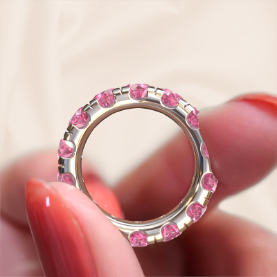 Das ist unser Jackie 4.7-Ring. Dieser spezielle Typ wird als eternity Ring bezeichnet und ist mit einer durchgehenden Linie von identisch geschliffenen Edelsteinen besetzt. Er ist aus Platin und mit kleineren 4.7 mm Pink Saphir besetzt. Die erstaunlichen Pink Saphir sind identisch in der Größe und im Ringband platziert. Unsere Pink Saphir werden sorgfältig ausgewählt, damit sie identisch sind und somit das beste Ergebnis erzielen. Um das beste Ergebnis zu erzielen, positioniert unser Juwelier alle Pink Saphir von Hand und mit größter Sorgfalt. Unsere Juweliere haben nur ein Ziel, nämlich den perfekten Ring zu kreieren. Deshalb lieben wir, was wir tun. Am Ende bekommen Sie einen atemberaubenden, exklusive Platin Vorsteckring mit einer Reihe von Pink Saphir, die weder Anfang noch Ende zu haben scheinen. Das perfekte Symbol für Ihre unsterbliche Liebe zu ihr! Ist sie nicht eine Schönheit? Da wir unsere eigenen Ringe entwerfen und liefern, können wir Ihnen einen Ring zu einem Preis anbieten, den Sie nirgendwo anders finden. Ein Ring wird auf Bestellung angefertigt, wodurch kein überschüssiges Material anfällt. So können wir Ihnen ein gutes Angebot zum besten Preis machen. Wir verstehen, dass es sich riskant anfühlt, Ihren Ring online zu kaufen. Jedoch helfen wir Ihnen gerne beim Designprozess unter Berücksichtigung Ihres Budgets.Unser Team von talentierten, leidenschaftlichen Designern fügt unserer Online-Kollektion täglich neue Ringe-Designs hinzu. Unser Ziel dabei ist es, Ihnen eine große Vielfalt an Schmuckstücken anbieten zu können. Bitte zögern Sie nicht, ein Angebot anzufordern, wenn Sie spezielle Wünsche für Ihren Ring haben. Wir garantieren Ihnen ein Angebot, das Sie nicht ablehnen können.Um es einfacher zu machen, bieten wir eine kostenlose 30-tägige Rücksendung.