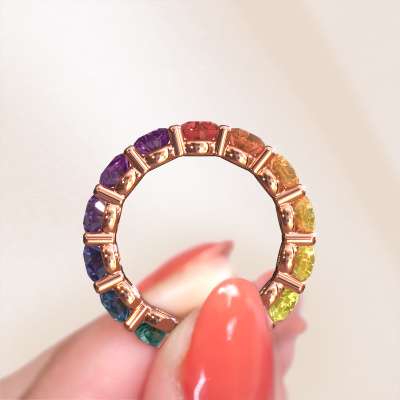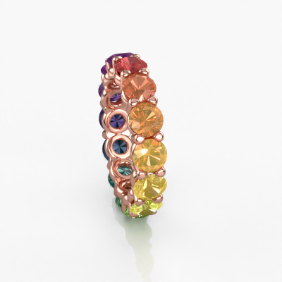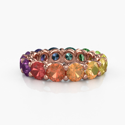 Das ist unser Heddy rnd 4.7-Ring. Dieser spezielle Typ wird als Eternity ring bezeichnet und ist mit einer durchgehenden Linie von identisch geschliffenen Edelsteinen besetzt. Er ist aus 14 Karat Roségold und mit kleineren Rainbow Saphir 1 4.7 mm besetzt. Dieser Roségold Eternity Ring ist eine wunderschöne und sinnvolle Möglichkeit, Ihrem Antrag eine besondere Note zu verleihen. Die herrlich gleichmäßig geformten Rainbow Saphir 1 sind rund um den Ring eingefasst. Die identischen Rainbow Saphir 1 werden sorgfältig ausgewählt, um dem Ring eine maximale Wirkung zu verleihen. Denken Sie daran, dass wir natürliche Ressourcen verwenden. Daher sind kleine Unterschiede zwischen den Steinen üblich. Der besondere Effekt wird durch die präzise Positionierung der Rainbow Saphir 1 noch verstärkt. Dies erfordert äußerste Präzision und eine geschickte Hand. Für unsere erfahrenen Juweliere ist die pure Leidenschaft. Am Ende bekommen Sie einen Ring mit einer Reihe von Rainbow Saphir 1, die weder Anfang noch Ende zu haben scheinen. Das perfekte Symbol für Ihre Liebe zu ihr! Ist sie nicht eine Schönheit? Da wir unsere eigenen Ringe entwerfen und liefern, können wir Ihnen einen Ring zu einem Preis anbieten, den Sie nirgendwo anders finden. Ein Ring wird auf Bestellung angefertigt, wodurch kein überschüssiges Material anfällt. So können wir Ihnen ein gutes Angebot zum besten Preis machen. Wir verstehen, dass es sich riskant anfühlt, Ihren Ring online zu kaufen. Jedoch helfen wir Ihnen gerne beim Designprozess unter Berücksichtigung Ihres Budgets.Unser Team von talentierten, leidenschaftlichen Designern fügt unserer Online-Kollektion täglich neue Ringe-Designs hinzu. Unser Ziel dabei ist es, Ihnen eine große Vielfalt an Schmuckstücken anbieten zu können. Bitte zögern Sie nicht, ein Angebot anzufordern, wenn Sie spezielle Wünsche für Ihren Ring haben. Wir garantieren Ihnen ein Angebot, das Sie nicht ablehnen können.Um es einfacher zu machen, bieten wir eine kostenlose 30-tägige Rücksendung.