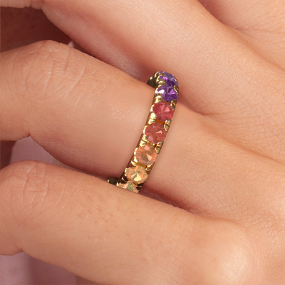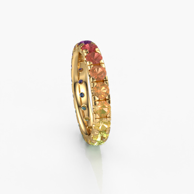 Das ist unser Jackie 3.4-Ring. Dieser spezielle Typ wird als Eternity ring bezeichnet und ist mit einer durchgehenden Linie von identisch geschliffenen Edelsteinen besetzt. Er ist aus 14 Karat Gold und mit kleineren Rainbow Saphir 1 3.4 mm besetzt. Dieser Gold Eternity Ring ist eine wunderschöne und sinnvolle Möglichkeit, Ihrem Antrag eine besondere Note zu verleihen. Die herrlich gleichmäßig geformten Rainbow Saphir 1 sind rund um den Ring eingefasst. Die identischen Rainbow Saphir 1 werden sorgfältig ausgewählt, um dem Ring eine maximale Wirkung zu verleihen. Denken Sie daran, dass wir natürliche Ressourcen verwenden. Daher sind kleine Unterschiede zwischen den Steinen üblich. Der besondere Effekt wird durch die präzise Positionierung der Rainbow Saphir 1 noch verstärkt. Dies erfordert äußerste Präzision und eine geschickte Hand. Für unsere erfahrenen Juweliere ist die pure Leidenschaft. Am Ende bekommen Sie einen Vorsteckring mit einer Reihe von Rainbow Saphir 1, die weder Anfang noch Ende zu haben scheinen. Das perfekte Symbol für Ihre Liebe zu ihr! Ist sie nicht eine Schönheit? Nach Erhalt Ihrer Bestellung beginnen unsere Goldschmiede mit Leidenschaft den kreativen Prozess und fertigen Ihren Ring in unserem eigenen Studio. Da wir keine großen Lager haben, werden diese Kosten nicht an Sie weitergegeben. Unsere Preisgestaltung ist der Beweis dafür! Wir bieten Schmuck zum niedrigsten Preis, garantiert.Unsere talentierten, leidenschaftlichen Designer fügen unserer Online-Kollektion täglich neue Designs hinzu. Zusammen versuchen sie, eine vielfältige Kollektion feinster Schmuckstücke zu erstellen. Wenn Sie es vorziehen, einen Ring nach Ihrem eigenen Entwurf zu machen, können Sie gerne ein Angebot anfordern. Wir machen Ihnen ein großartiges Angebot, basierend auf Qualität und Preis.Um es einfacher zu machen, bieten wir eine kostenlose 30-tägige Rücksendung.