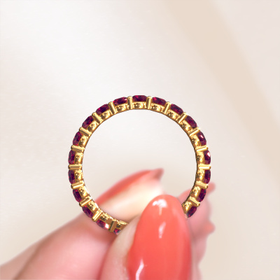 Das ist unser Heddy rnd 2.7-Ring. Dieser spezielle Typ wird als Eternity ring bezeichnet und ist mit einer durchgehenden Linie von identisch geschliffenen Edelsteinen besetzt. Er ist aus 14 Karat Gold und mit kleineren Rhodolit 2.7 mm besetzt. Dieser Gold Eternity Ring ist eine wunderschöne und sinnvolle Möglichkeit, Ihrem Antrag eine besondere Note zu verleihen. Die herrlich gleichmäßig geformten Rhodolit sind rund um den Ring eingefasst. Die identischen Rhodolit werden sorgfältig ausgewählt, um dem Ring eine maximale Wirkung zu verleihen. Denken Sie daran, dass wir natürliche Ressourcen verwenden. Daher sind kleine Unterschiede zwischen den Steinen üblich. Der besondere Effekt wird durch die präzise Positionierung der Rhodolit noch verstärkt. Dies erfordert äußerste Präzision und eine geschickte Hand. Für unsere erfahrenen Juweliere ist die pure Leidenschaft. Am Ende bekommen Sie einen Vorsteckring mit einer Reihe von Rhodolit, die weder Anfang noch Ende zu haben scheinen. Das perfekte Symbol für Ihre Liebe zu ihr! Ist sie nicht eine Schönheit? Da wir unsere eigenen Ringe entwerfen und liefern, können wir Ihnen einen Ring zu einem Preis anbieten, den Sie nirgendwo anders finden. Ein Ring wird auf Bestellung angefertigt, wodurch kein überschüssiges Material anfällt. So können wir Ihnen ein gutes Angebot zum besten Preis machen. Wir verstehen, dass es sich riskant anfühlt, Ihren Ring online zu kaufen. Jedoch helfen wir Ihnen gerne beim Designprozess unter Berücksichtigung Ihres Budgets.Unser Team von talentierten, leidenschaftlichen Designern fügt unserer Online-Kollektion täglich neue Ringe-Designs hinzu. Unser Ziel dabei ist es, Ihnen eine große Vielfalt an Schmuckstücken anbieten zu können. Bitte zögern Sie nicht, ein Angebot anzufordern, wenn Sie spezielle Wünsche für Ihren Ring haben. Wir garantieren Ihnen ein Angebot, das Sie nicht ablehnen können.Um es einfacher zu machen, bieten wir eine kostenlose 30-tägige Rücksendung.